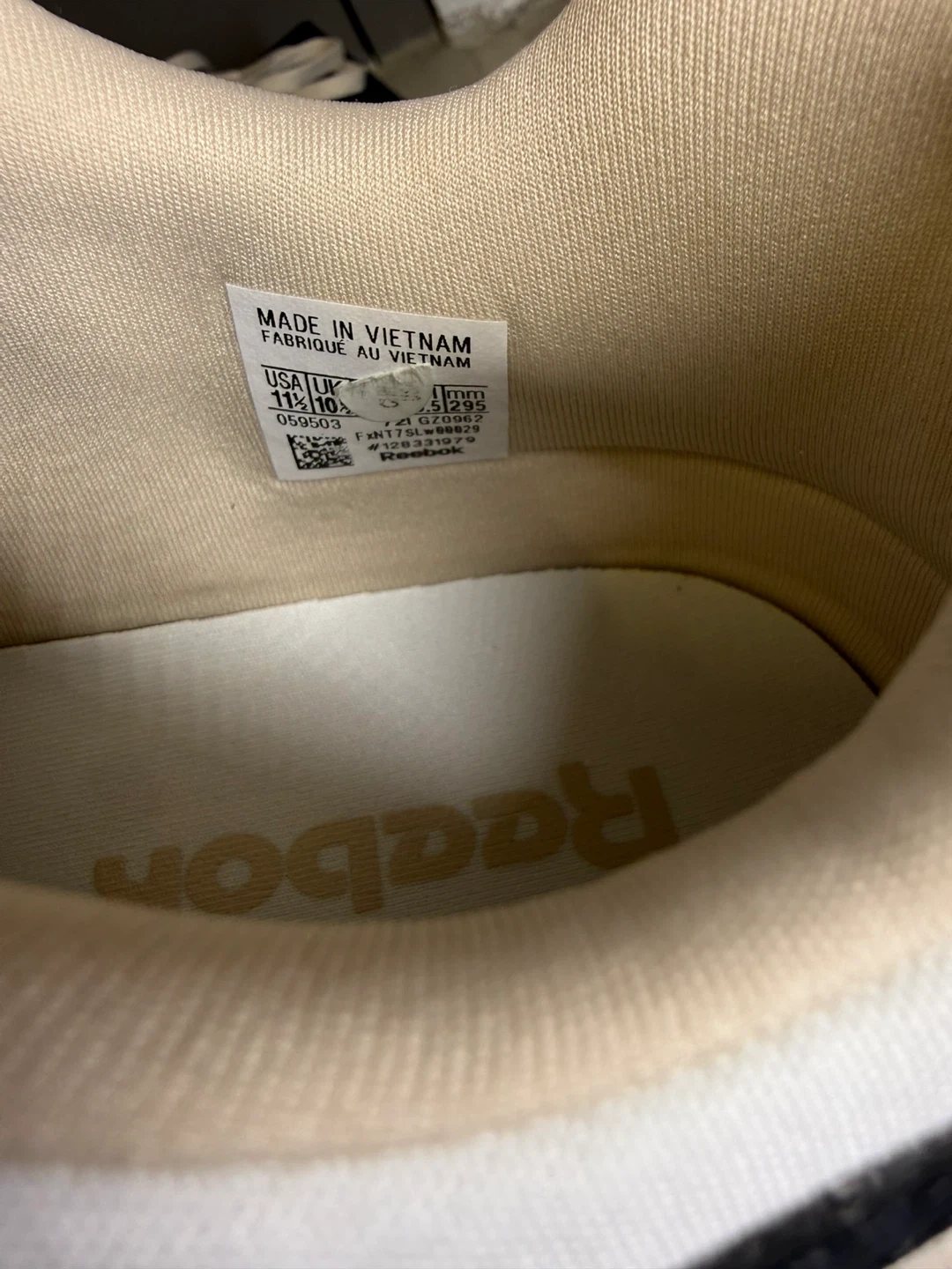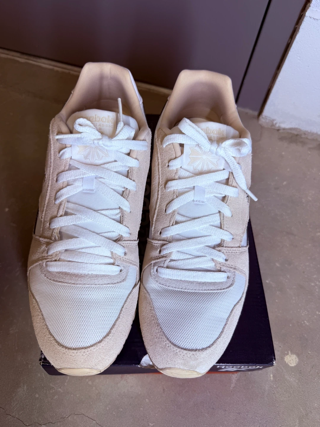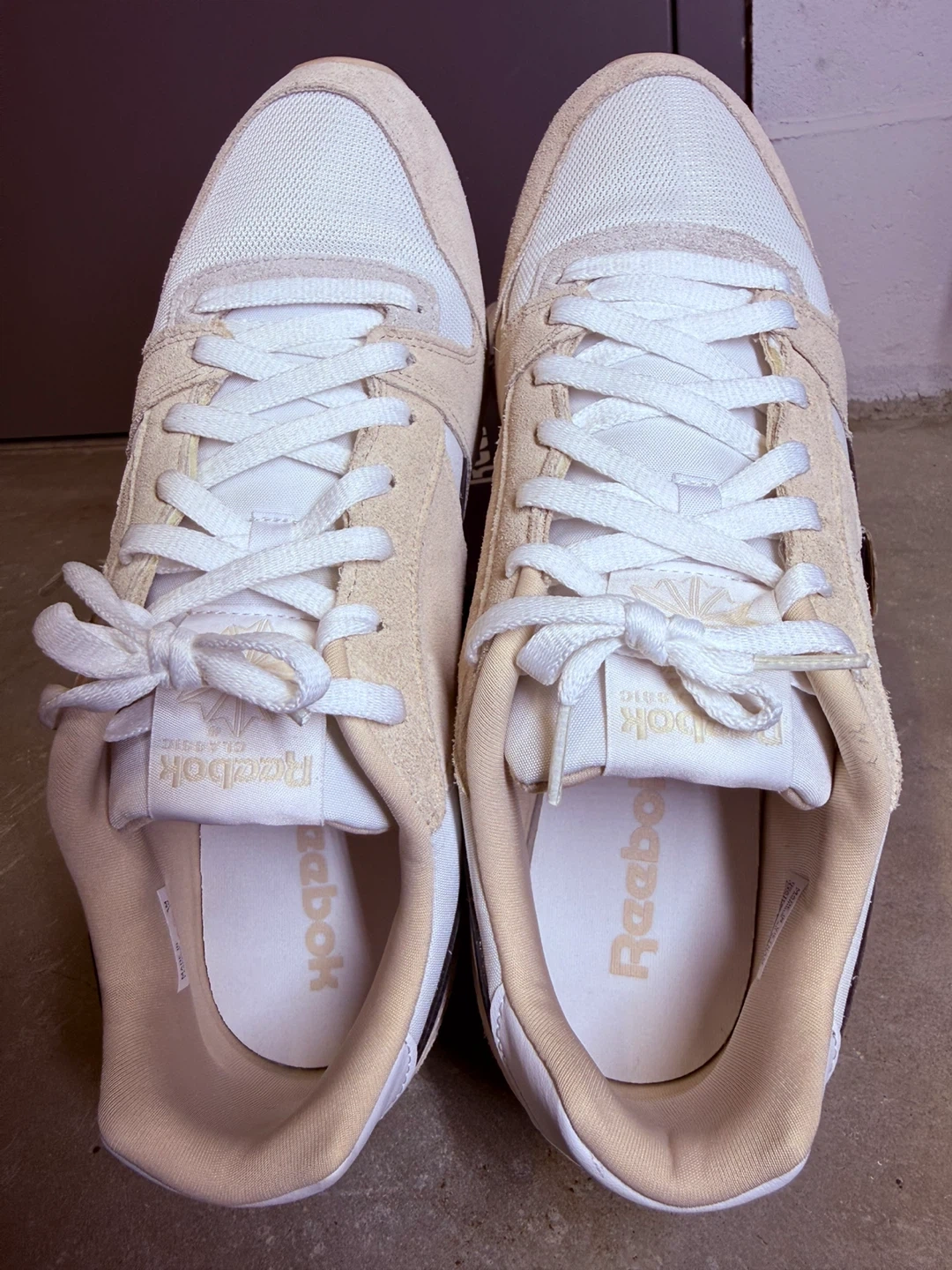 These Reebok GL 3000 sneakers come in a classic beige and white colourway. They feature a combination of suede and mesh uppers. Includes the original box. Size is 11.5 US men's.