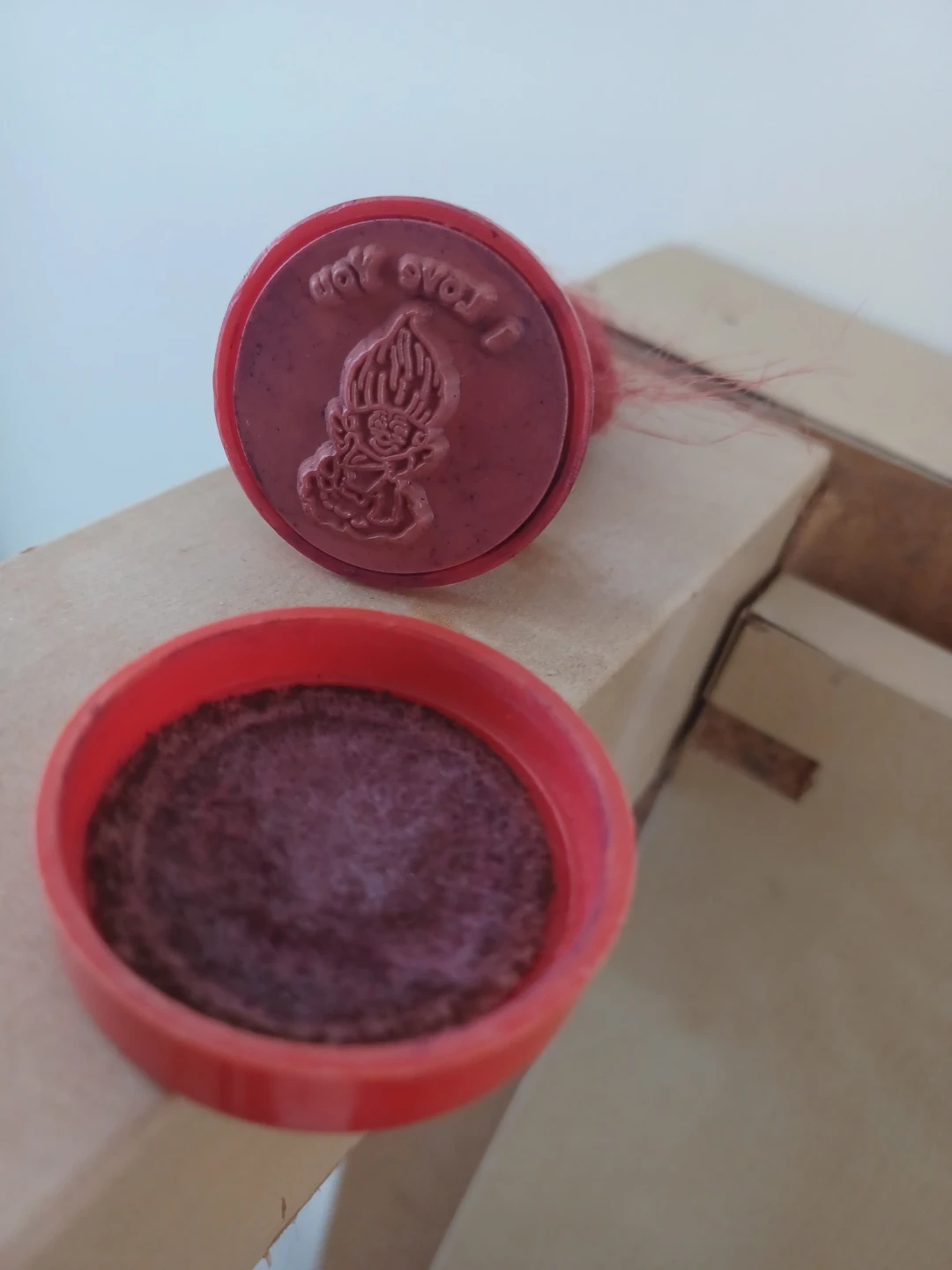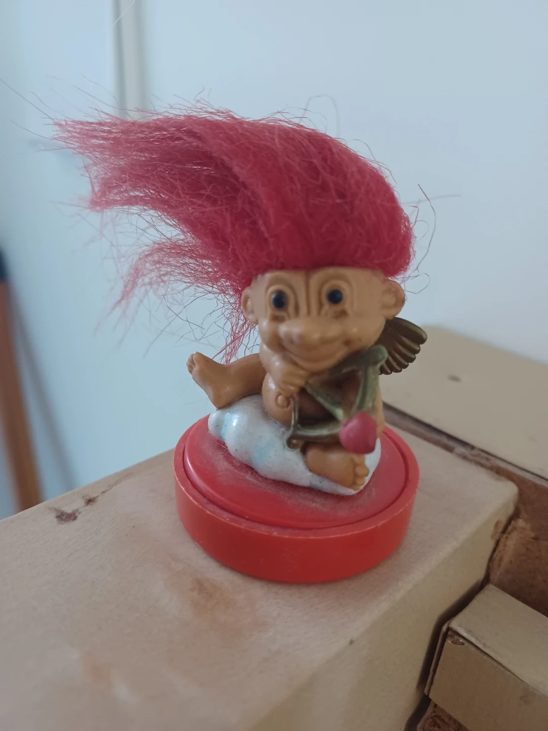 This is a vintage troll doll figure with a heart stamp on its base that reads 'I love you'. It has bright red hair and tiny wings, giving it a cupid-like appearance. Includes a red stamp lid.