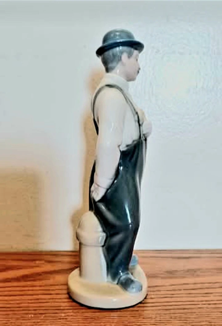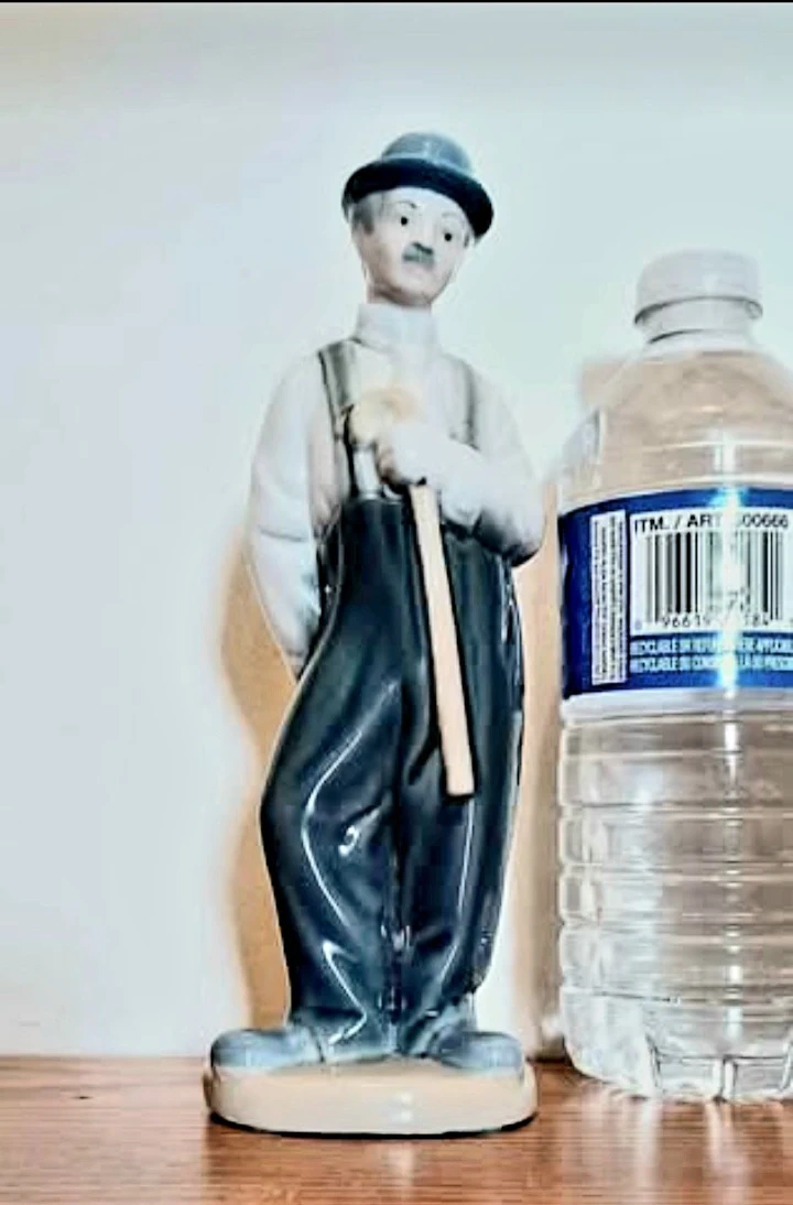 This is a vintage. Requena Charlie Chaplin Figurine. It depicts Chaplin wearing his signature bowler hat, baggy trousers, and holding a cane. The design is known for its realistic shape and colors.