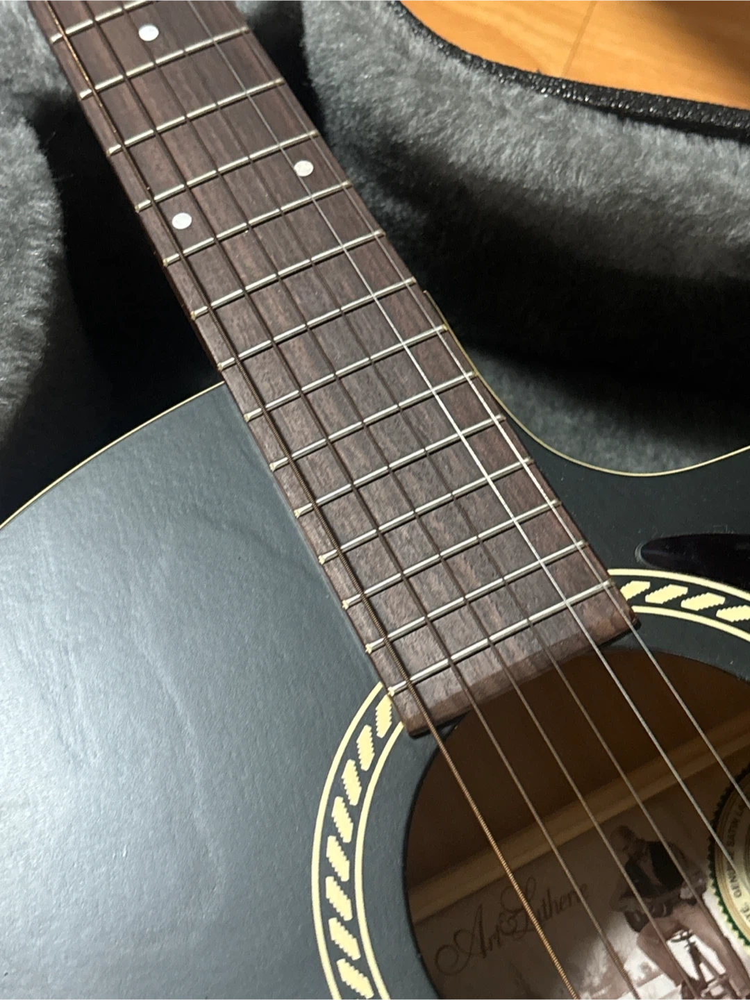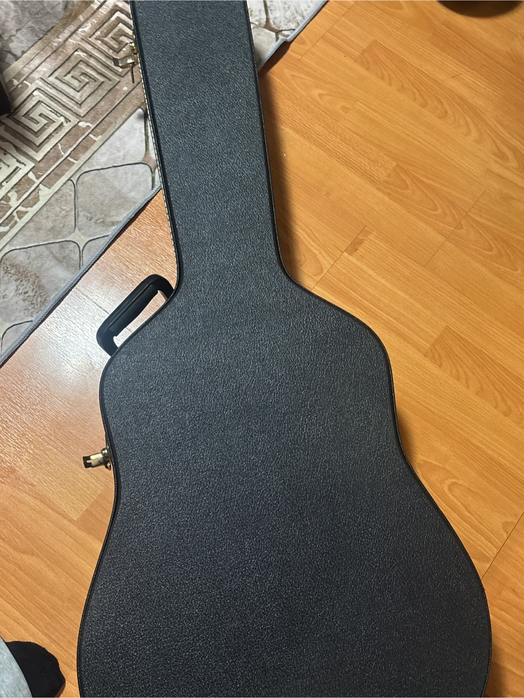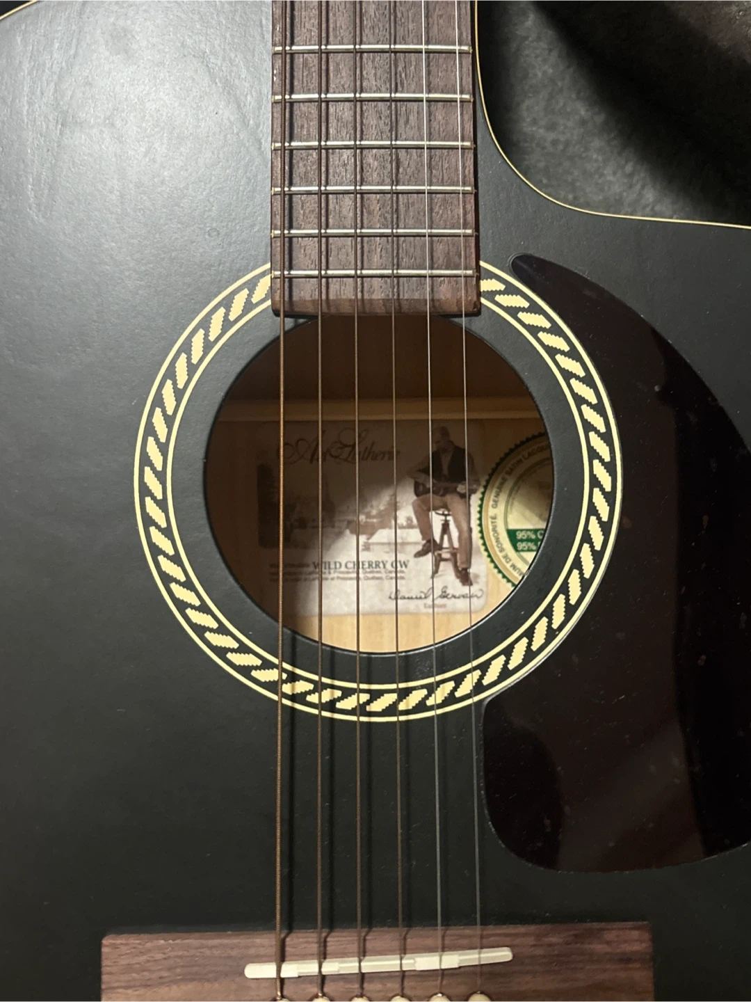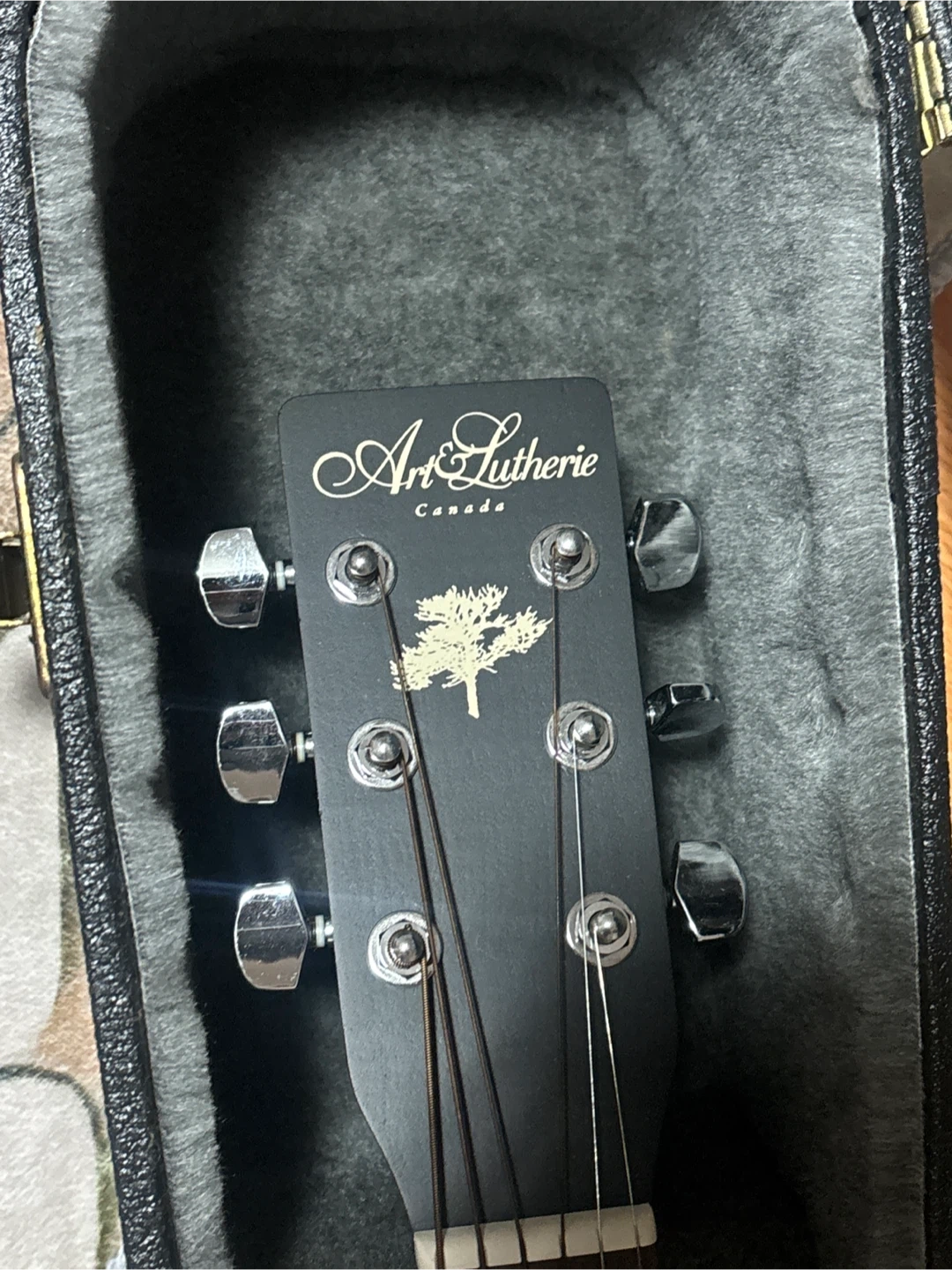 This is an Art & Lutherie "Wild Cherry CW" acoustic guitar in black. It's housed in a hardshell case for protection. Great for beginners and experienced players alike! It’s from a known brand by “ Godin Guitars”