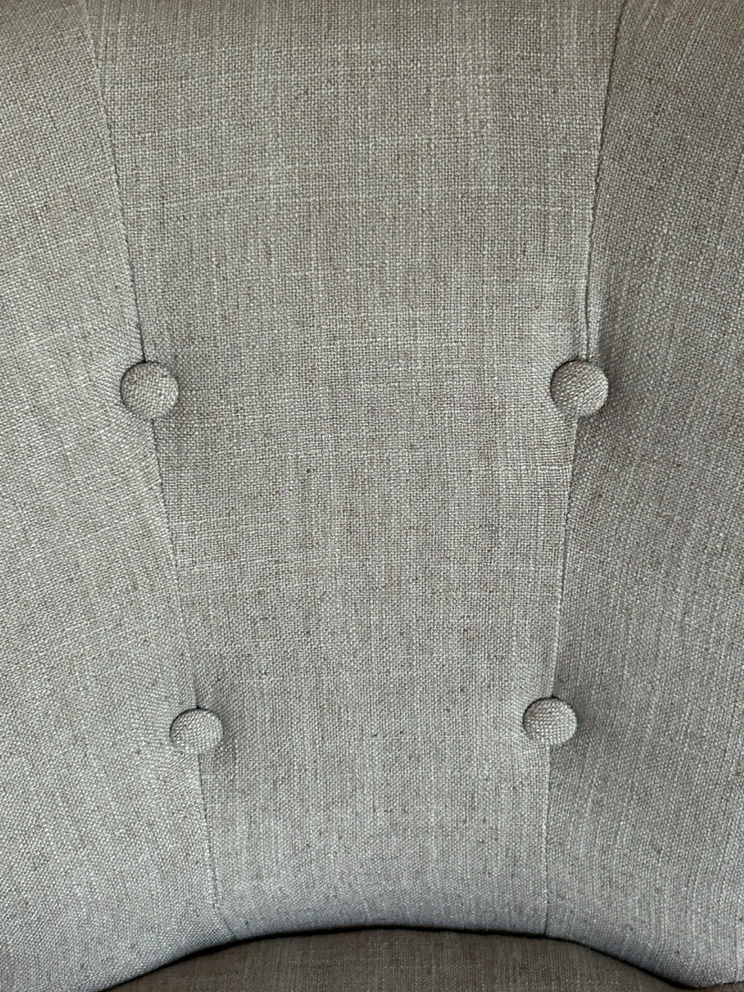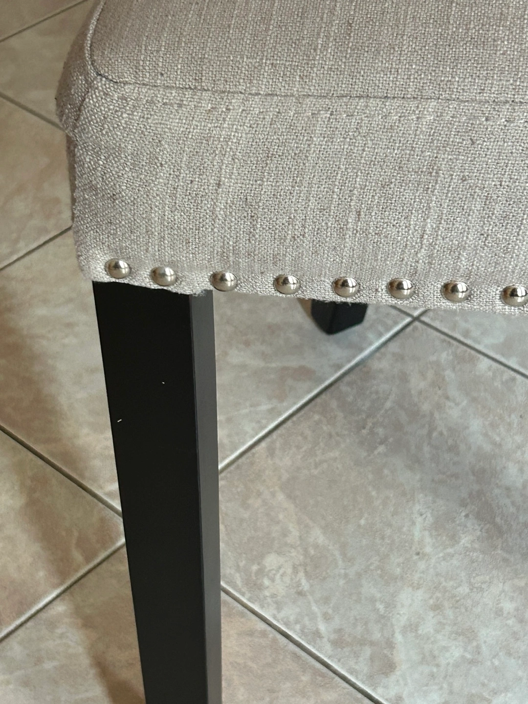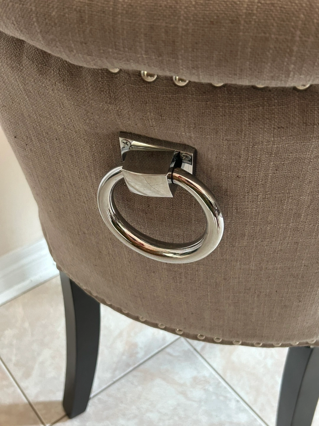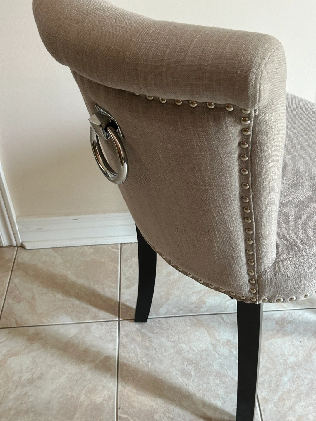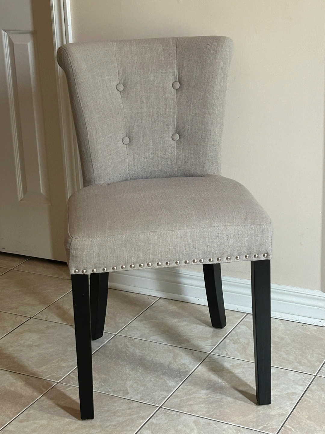 Selling a lovely upholstered dining chair! It features a neutral-toned fabric with button tufting on the back and a decorative ring detail. The chair has black legs and silver-toned nailhead trim. It's in great condition and would look great in any dining room or as an accent piece
