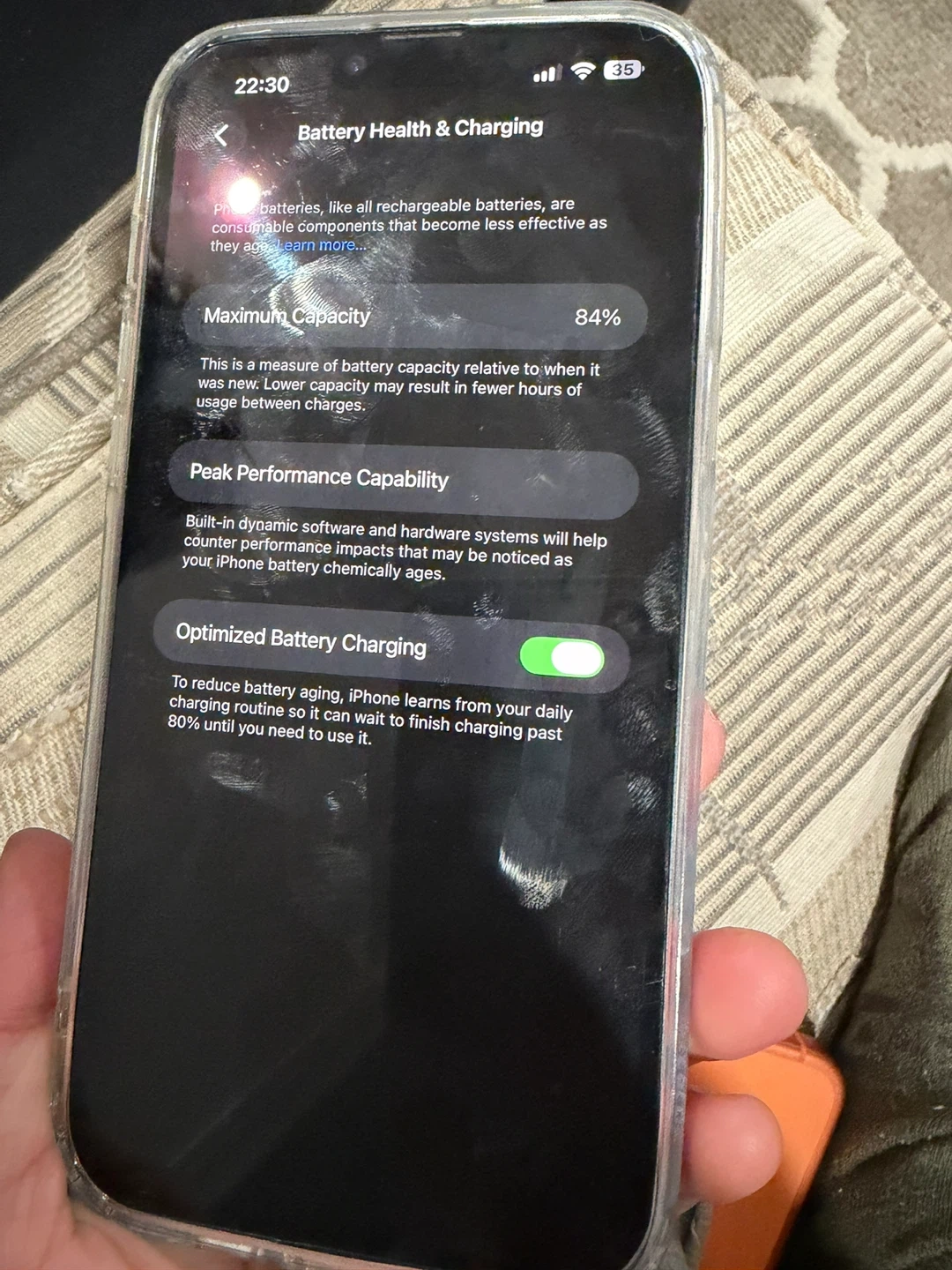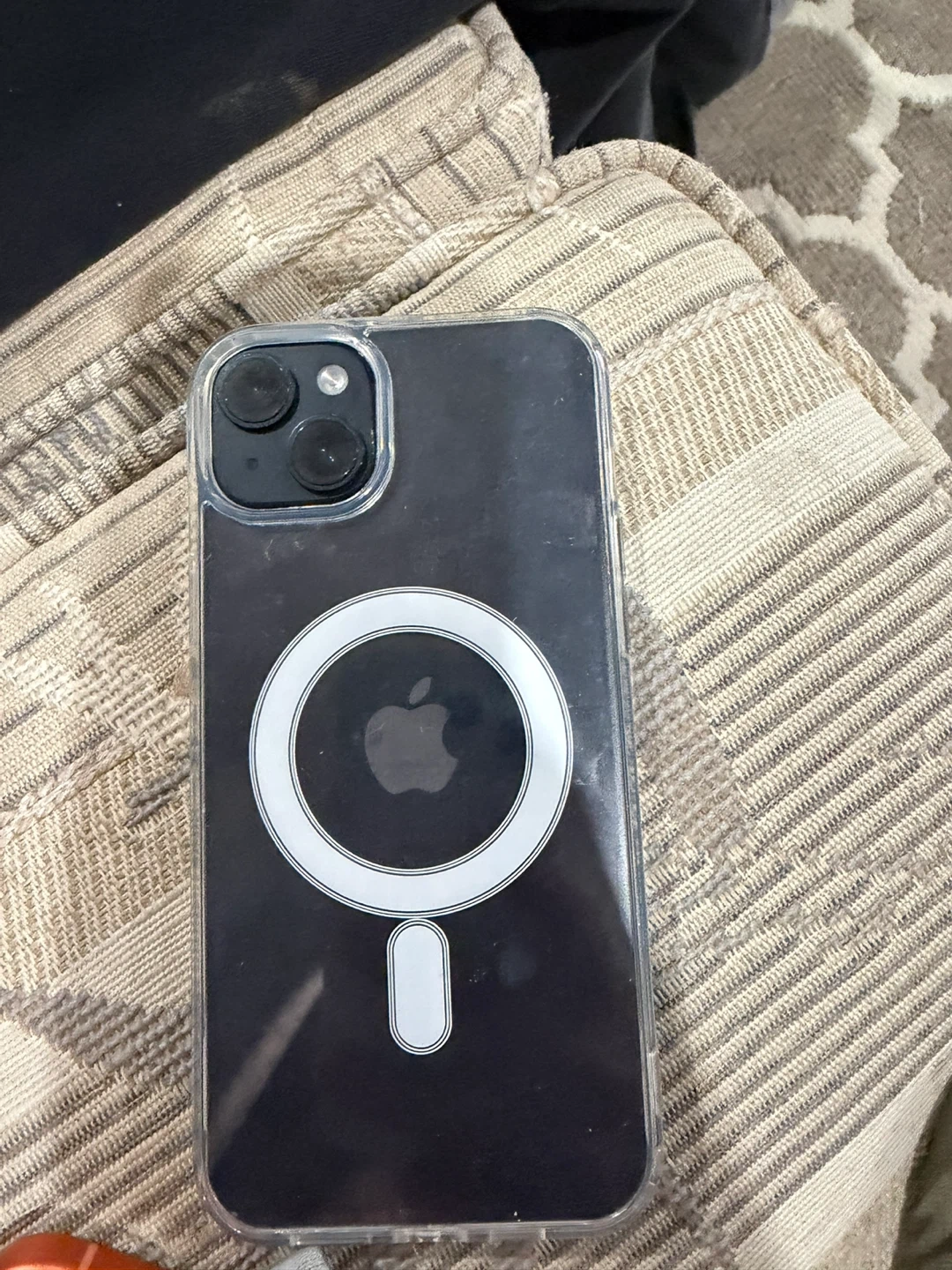 This is a clear iPhone 14 Plus with case with MagSafe compatibility. It offers protection for your phone and supports wireless charging accessories. Maximum battery capacity is 84%.