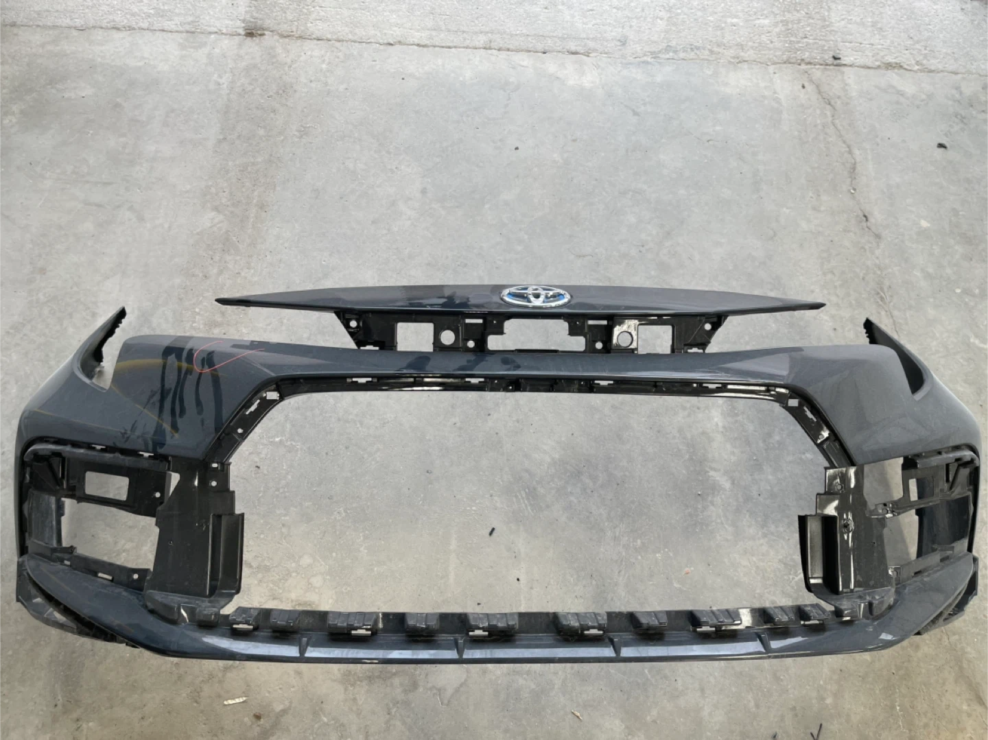 This is a used 2025 front bumper assembly for a Toyota vehicle. It's dark grey in colour and features the Toyota emblem. It has a little scratch.