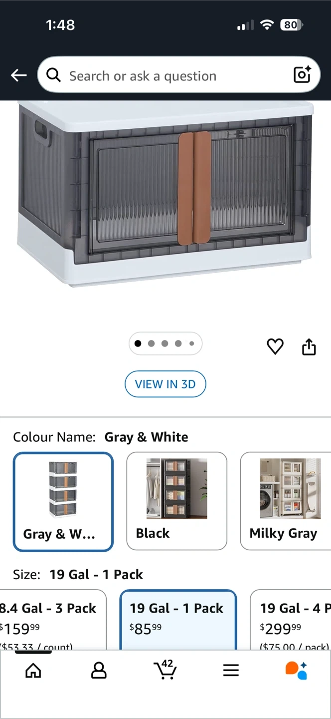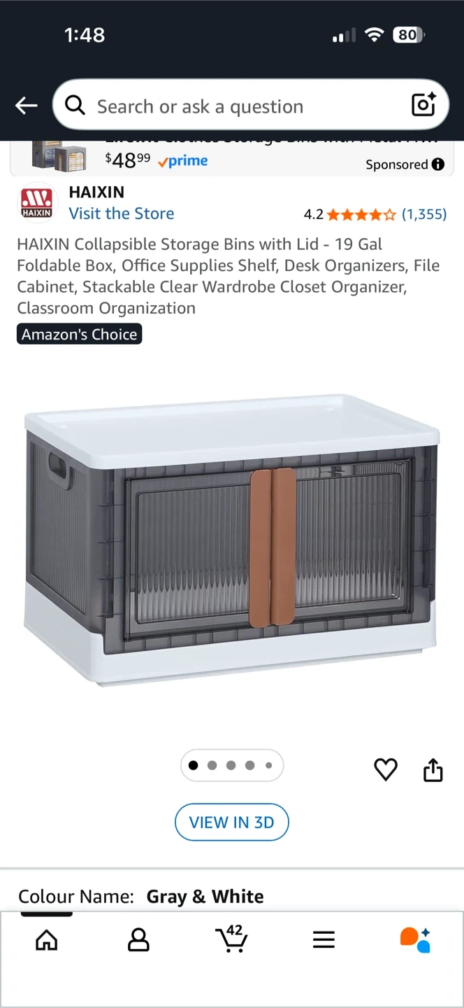 This is a HAIXIN collapsible storage bin with a lid. It's 19 gallons in size. The colour is Gray & White. It's stackable and designed for wardrobe or closet organization.