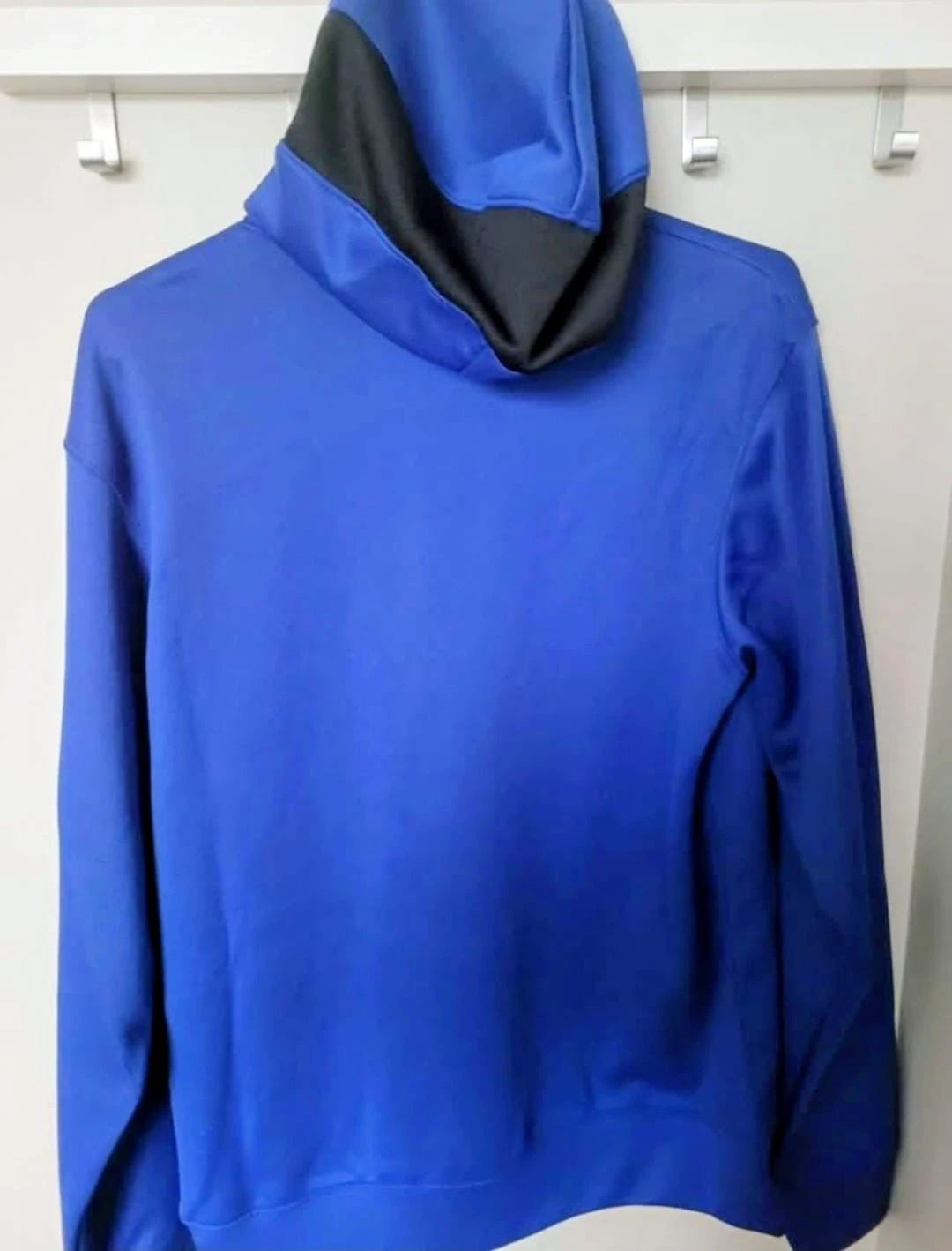 This is a blue Nike hoodie featuring the New York Knicks basketball logo and name. It's a pullover style with a front pouch pocket and a drawstring hood. Made from a blend of polyester and cotton.