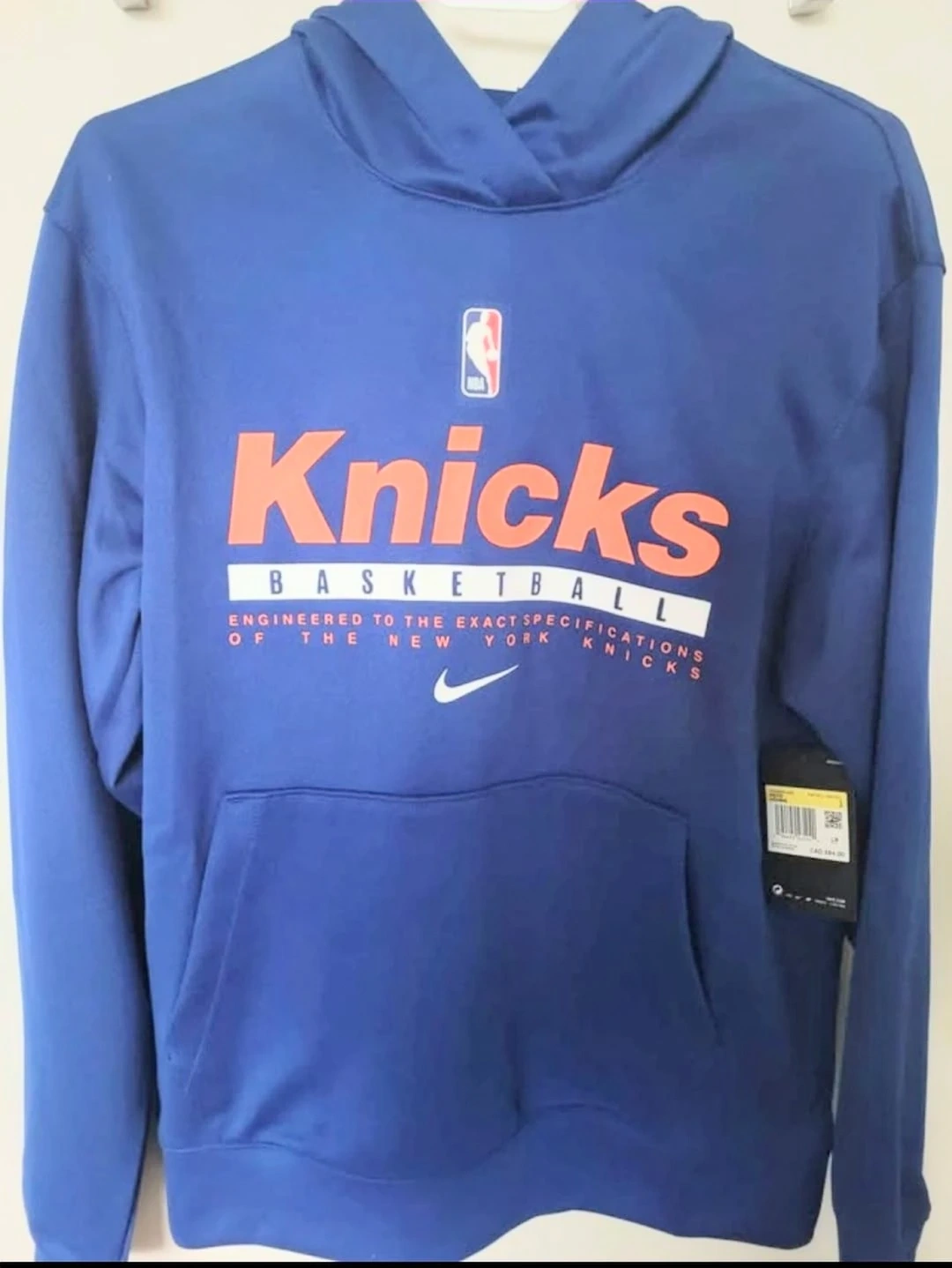 This is a blue Nike hoodie featuring the New York Knicks basketball logo and name. It's a pullover style with a front pouch pocket and a drawstring hood. Made from a blend of polyester and cotton.