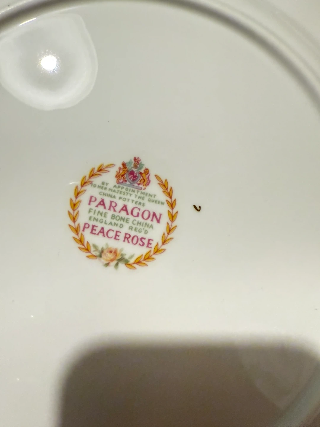 Beautiful Paragon fine bone china tea set in the Peace Rose pattern. This set includes three cups and 5 big dining plates, each adorned with a lovely rose design. Made in England.