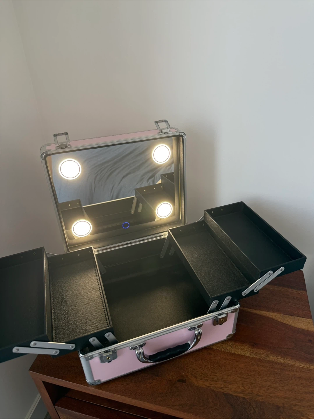 This limited-edition Vanity Trunk is perfect for storing and transporting your beauty essentials. It includes LED lights, a mirror, an aluminum frame, and reinforced corners for durability.