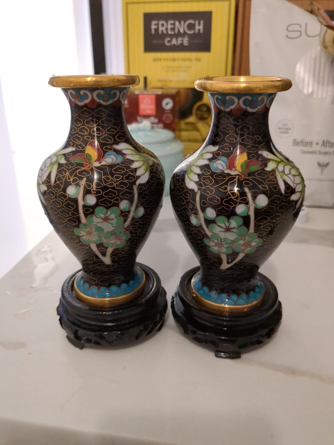 Selling a pair of beautiful cloisonne vases, each with its own stand! They come in the original box. Each vase is about 6.5 inches tall and 3 inches wide.
