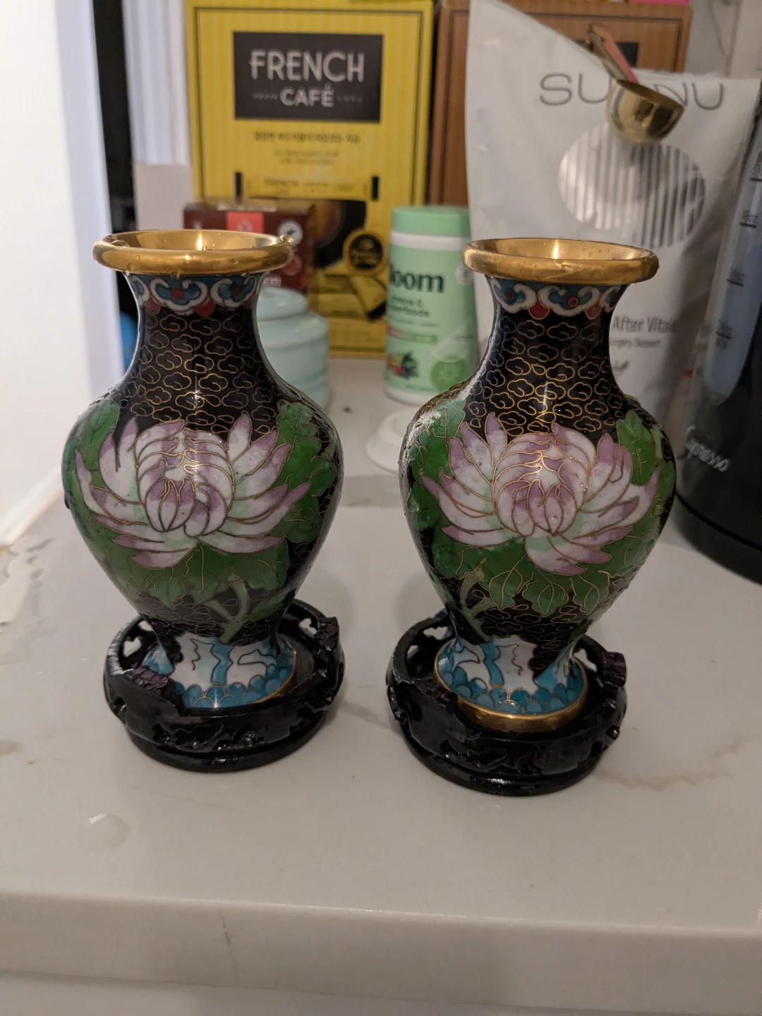 Selling a pair of beautiful cloisonne vases, each with its own stand! They come in the original box. Each vase is about 6.5 inches tall and 3 inches wide.