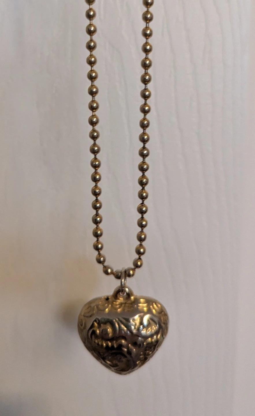 Selling a heart pendant necklace. It has a beaded chain and a heart-shaped pendant with floral details. It's in great condition and ready to add a touch of charm to your outfits.