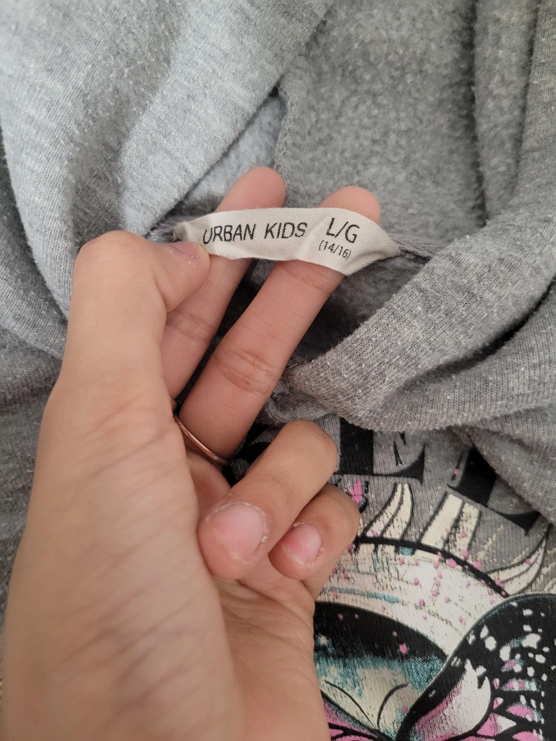 Grey hoodie from Urban Kids with a "Free Spirit" graphic featuring a butterfly and sun design. It's a size L/G (14/16) and has a front kangaroo pocket. Made from a soft cotton blend material.