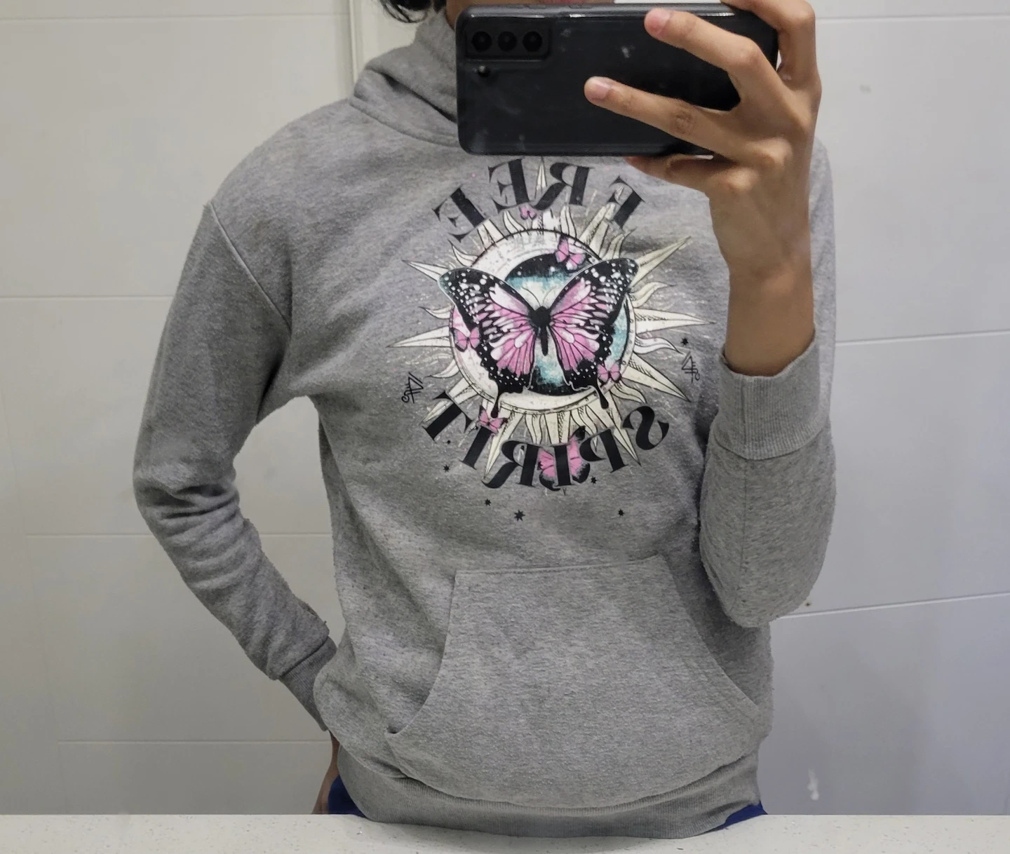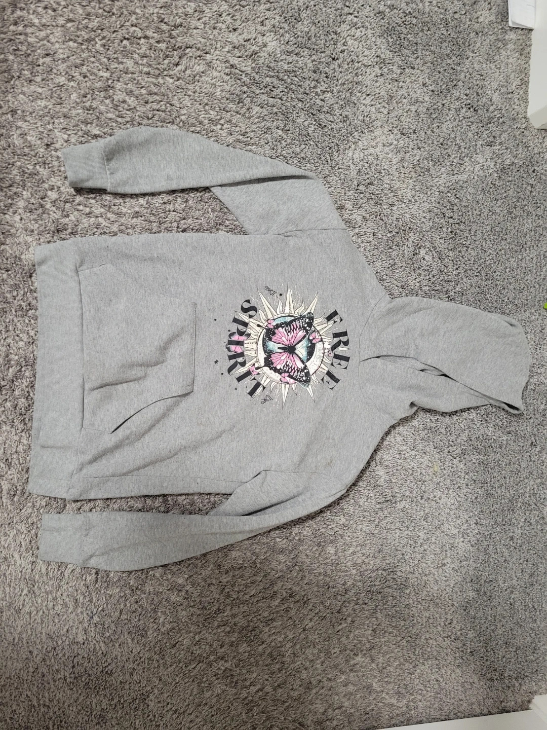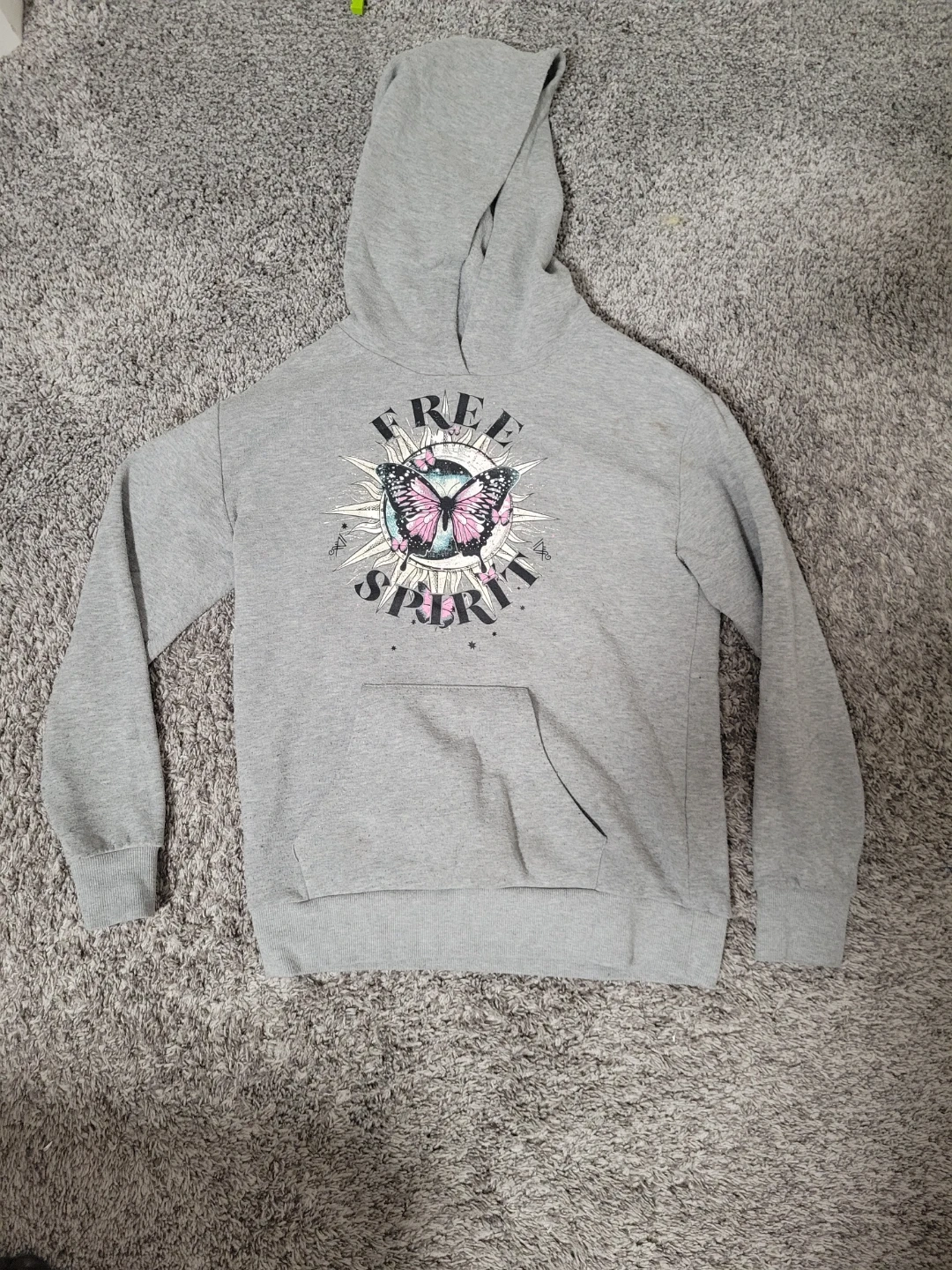 Grey hoodie from Urban Kids with a "Free Spirit" graphic featuring a butterfly and sun design. It's a size L/G (14/16) and has a front kangaroo pocket. Made from a soft cotton blend material.