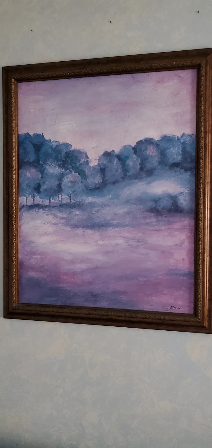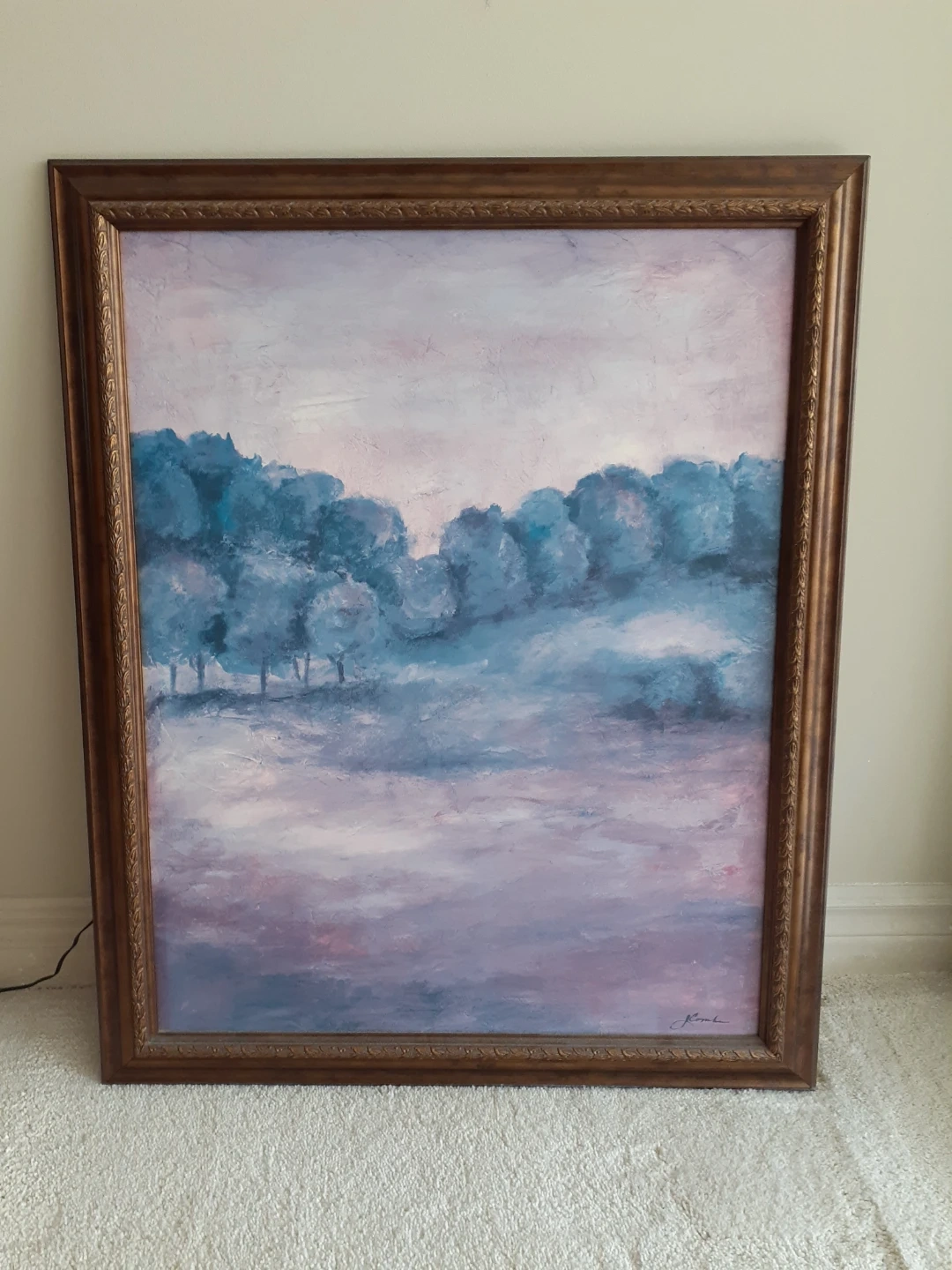 This is a framed painting depicting a serene landscape. It features soft purples and blues with a misty forest scene. The signature "J. Combi" is visible on the lower right. Comes in a decorative wooden frame. 31.5" L x 25.5" W