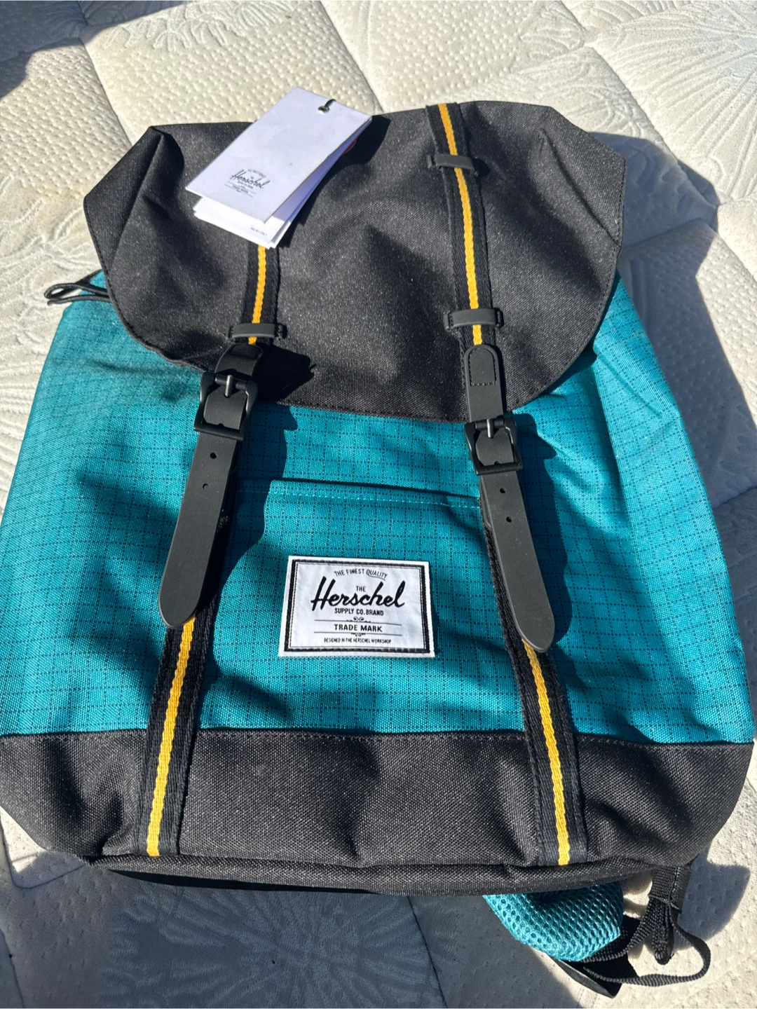 This Herschel backpack is teal and black. It's designed for everyday use. It features adjustable straps and a flap closure.