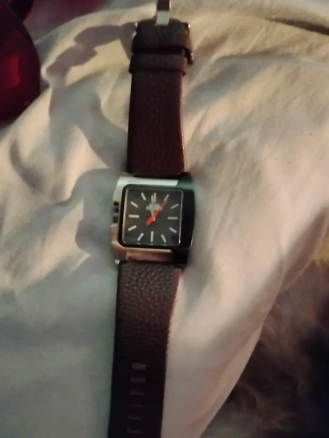 Diesel watch with a square black face and a textured brown leather strap. It features silver-toned hardware and an analogue display. This watch is a stylish accessory for everyday wear.