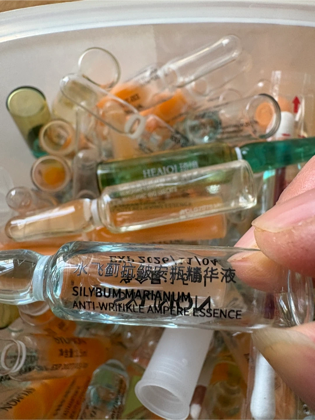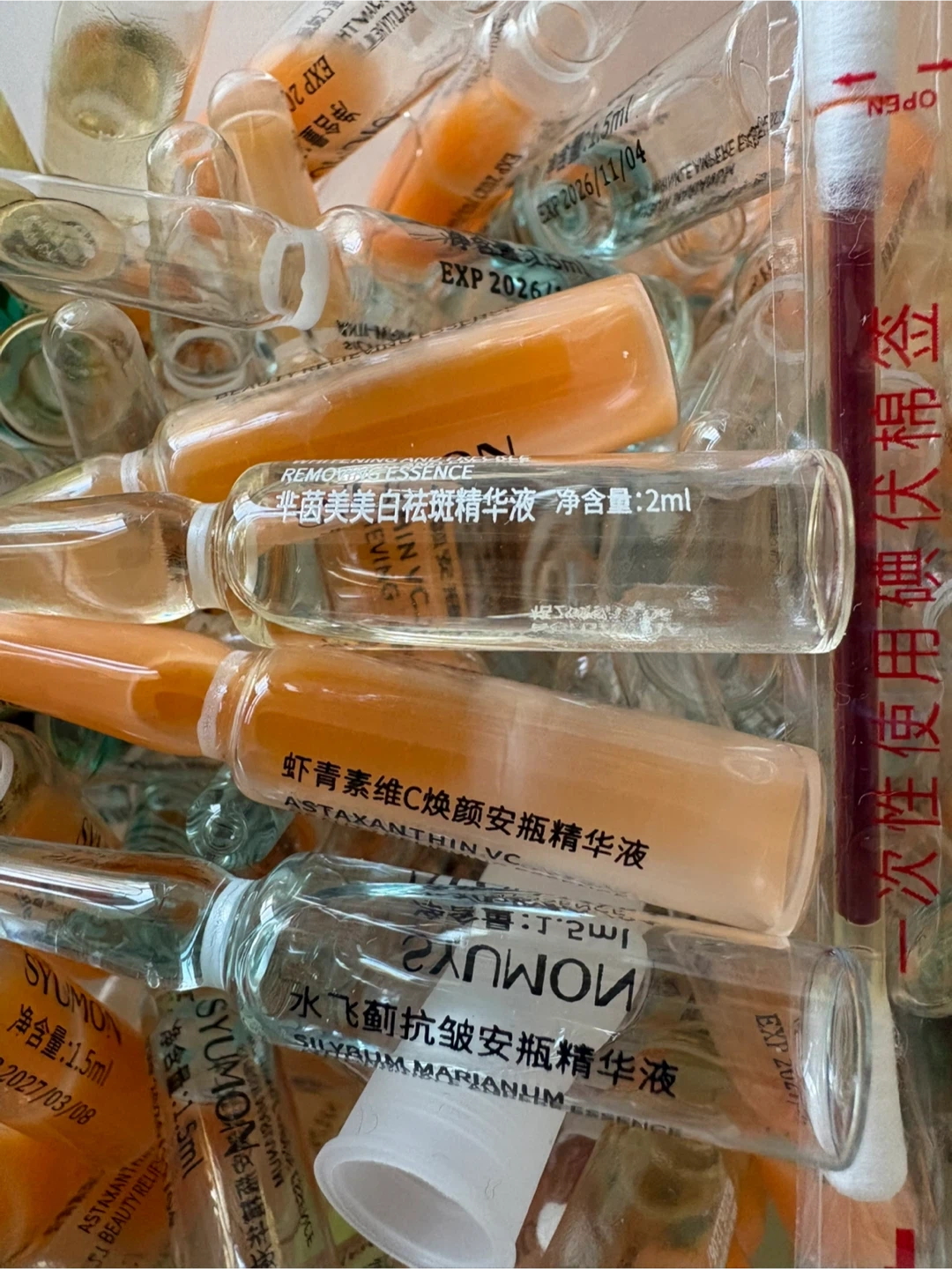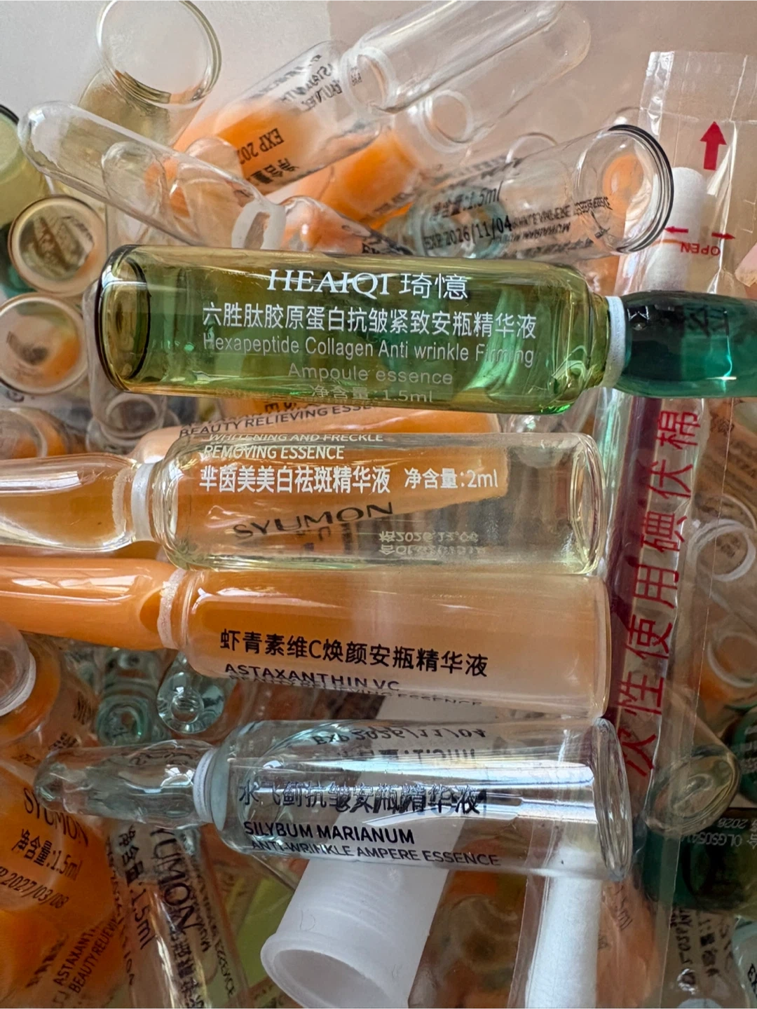 A collection of HEAIQI and SYUMON ampoule essences. Includes various formulations like Hexapeptide Collagen, Astaxanthin VC, and Silybum Marianum. Most vials contain 1.5ml or 2ml of essence. Some have expiry dates up to 2027.pickup at Morley trail NW
