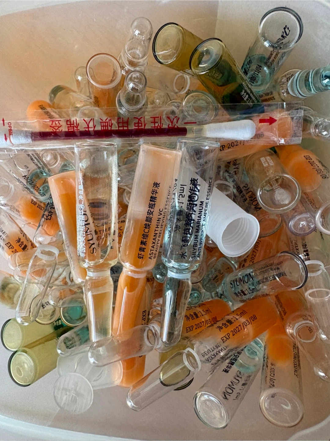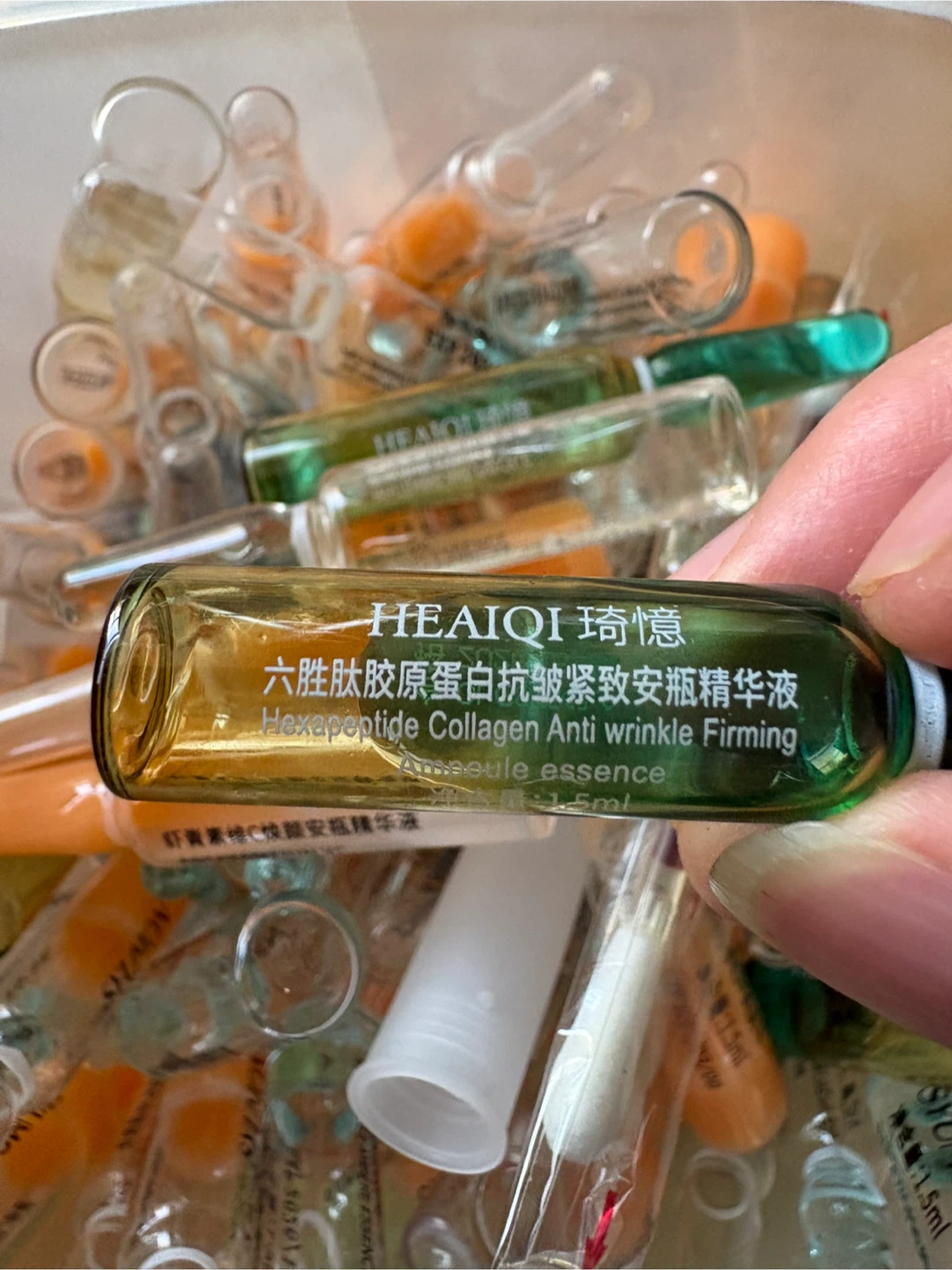 A collection of HEAIQI and SYUMON ampoule essences. Includes various formulations like Hexapeptide Collagen, Astaxanthin VC, and Silybum Marianum. Most vials contain 1.5ml or 2ml of essence. Some have expiry dates up to 2027.pickup at Morley trail NW