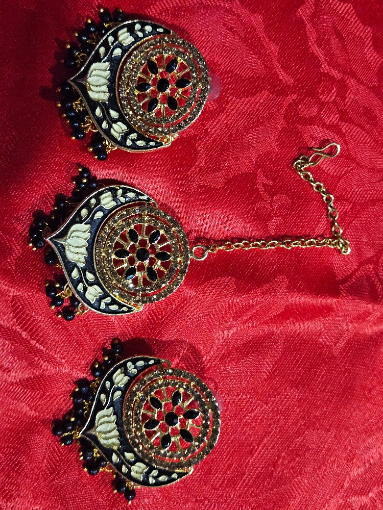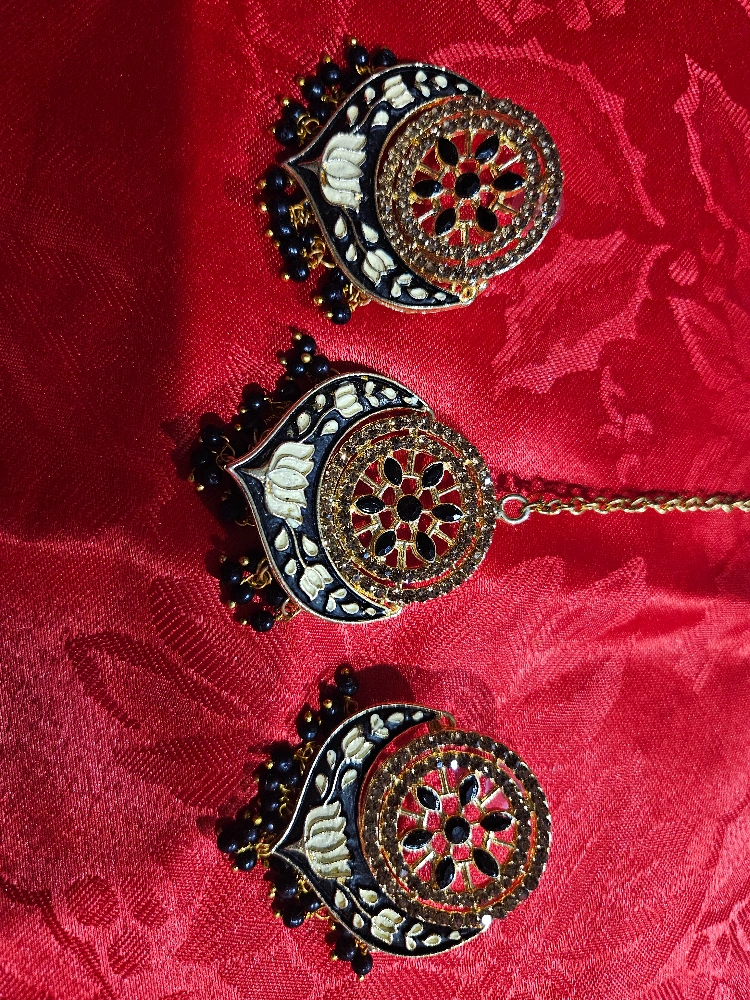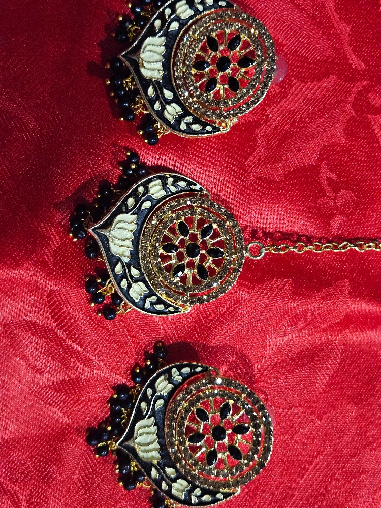 Beautiful Indian tikka headpiece with intricate detailing. The piece features a gold-tone finish with black and white accents, adorned with small black beads. Perfect for adding a touch of elegance to any outfit!