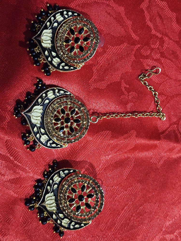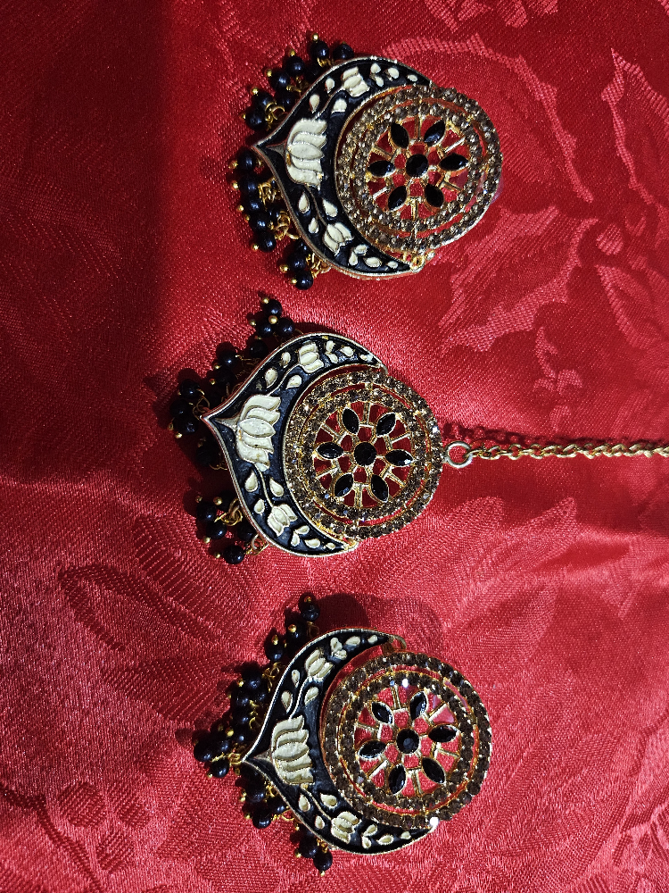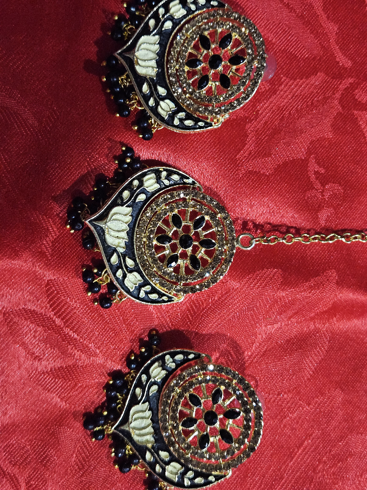 Beautiful Indian tikka headpiece with intricate detailing. The piece features a gold-tone finish with black and white accents, adorned with small black beads. Perfect for adding a touch of elegance to any outfit!