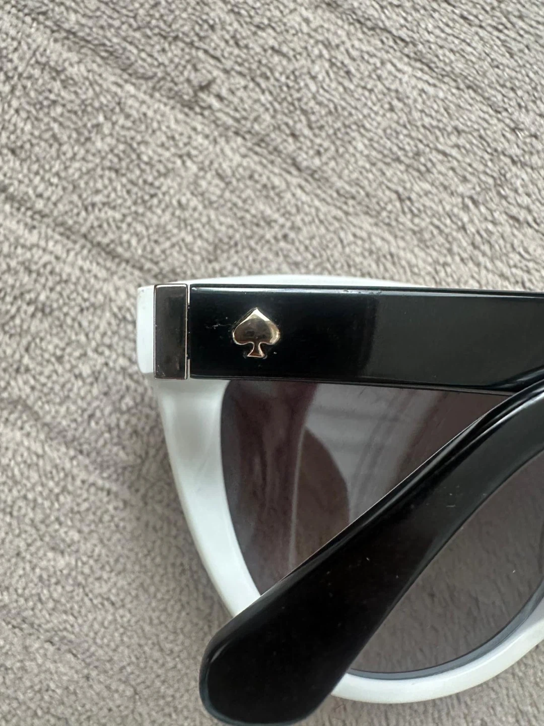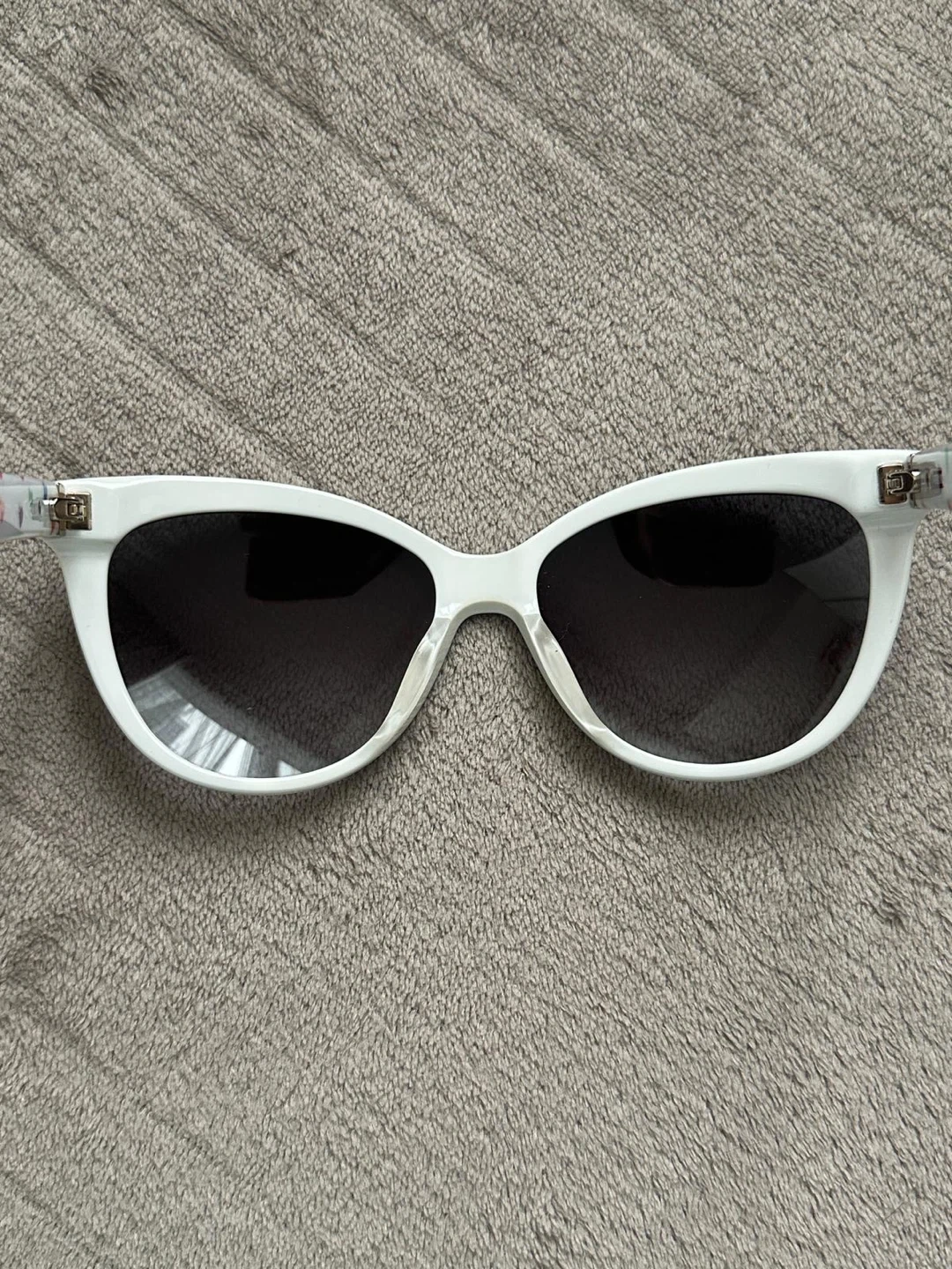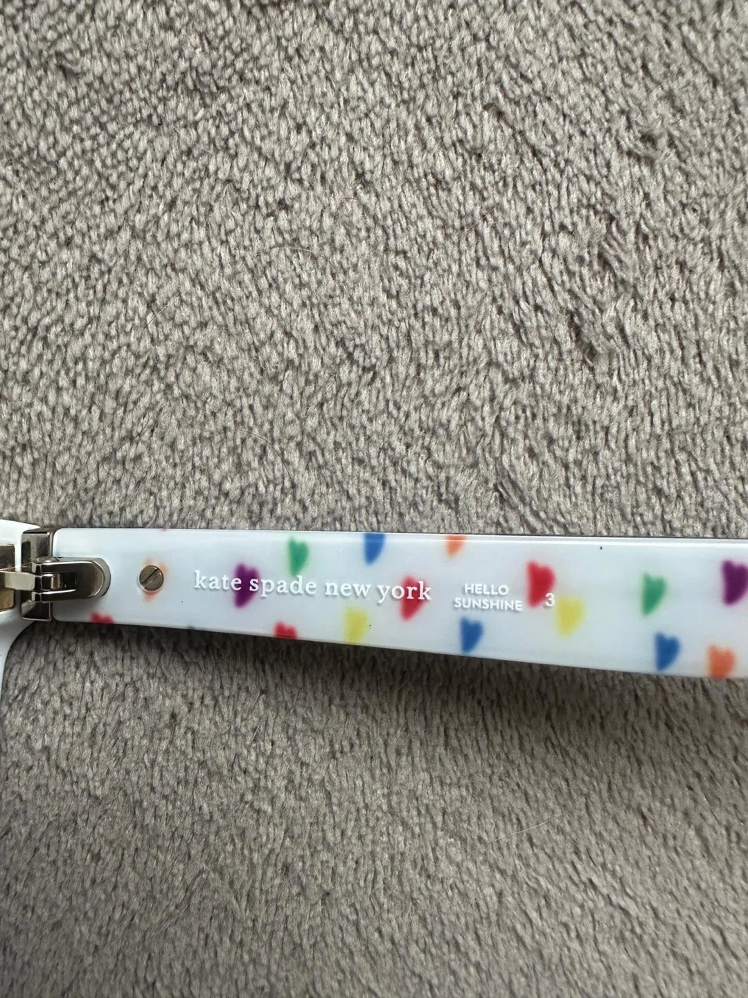 Cute Kate Spade sunglasses with a white frame and black lenses! The inside of the arms have a colourful heart pattern and the words "HELLO SUNSHINE 3" are printed on the inside of the right arm. Perfect for sunny days