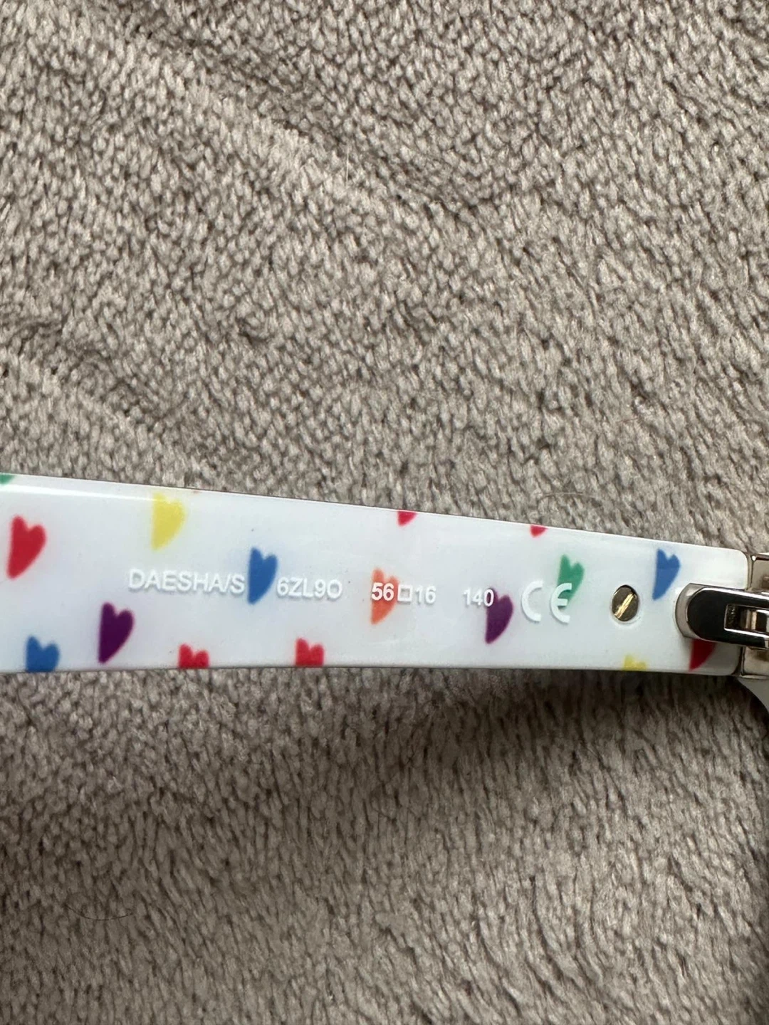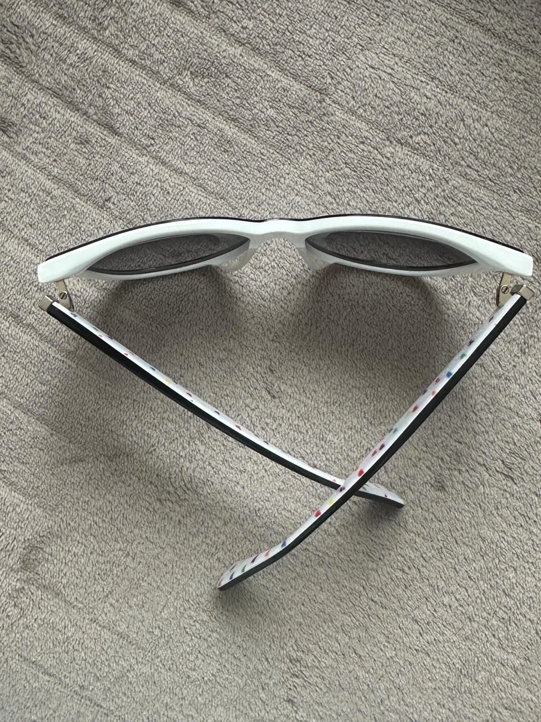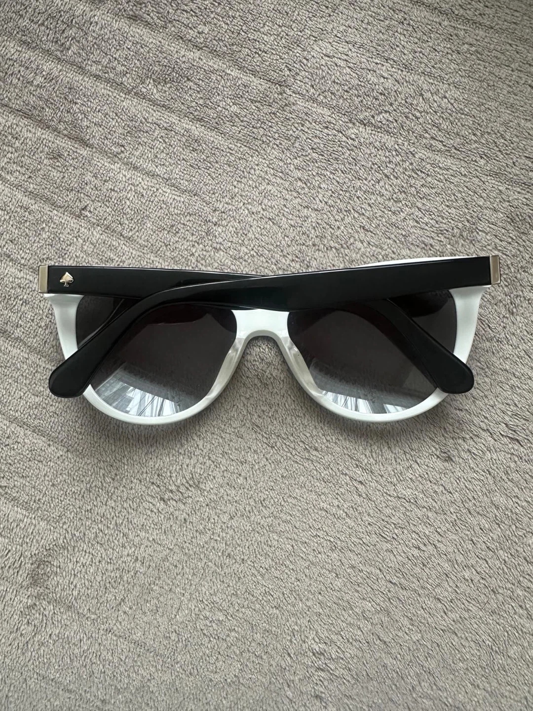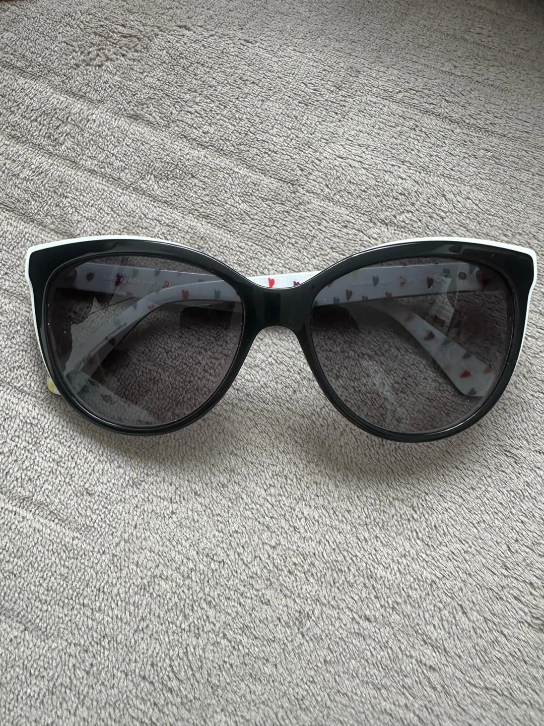 Cute Kate Spade sunglasses with a white frame and black lenses! The inside of the arms have a colourful heart pattern and the words "HELLO SUNSHINE 3" are printed on the inside of the right arm. Perfect for sunny days