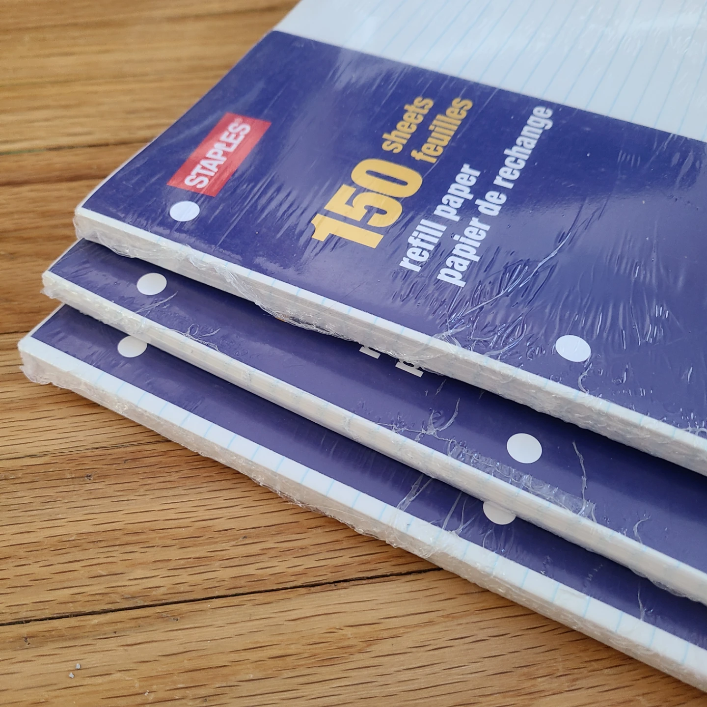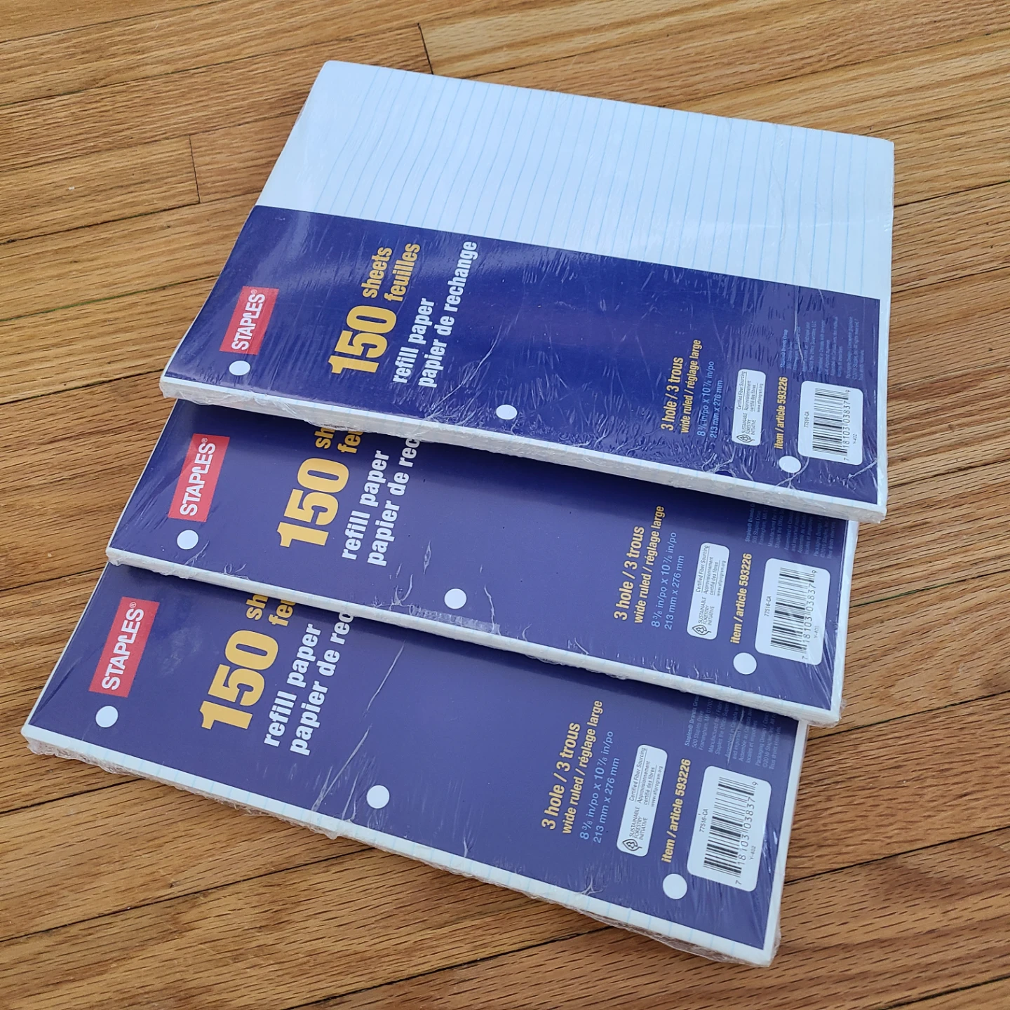 Three packs of Staples refill paper are included. Each pack has 150 sheets of wide ruled paper. It's 3-hole punched for binder use.