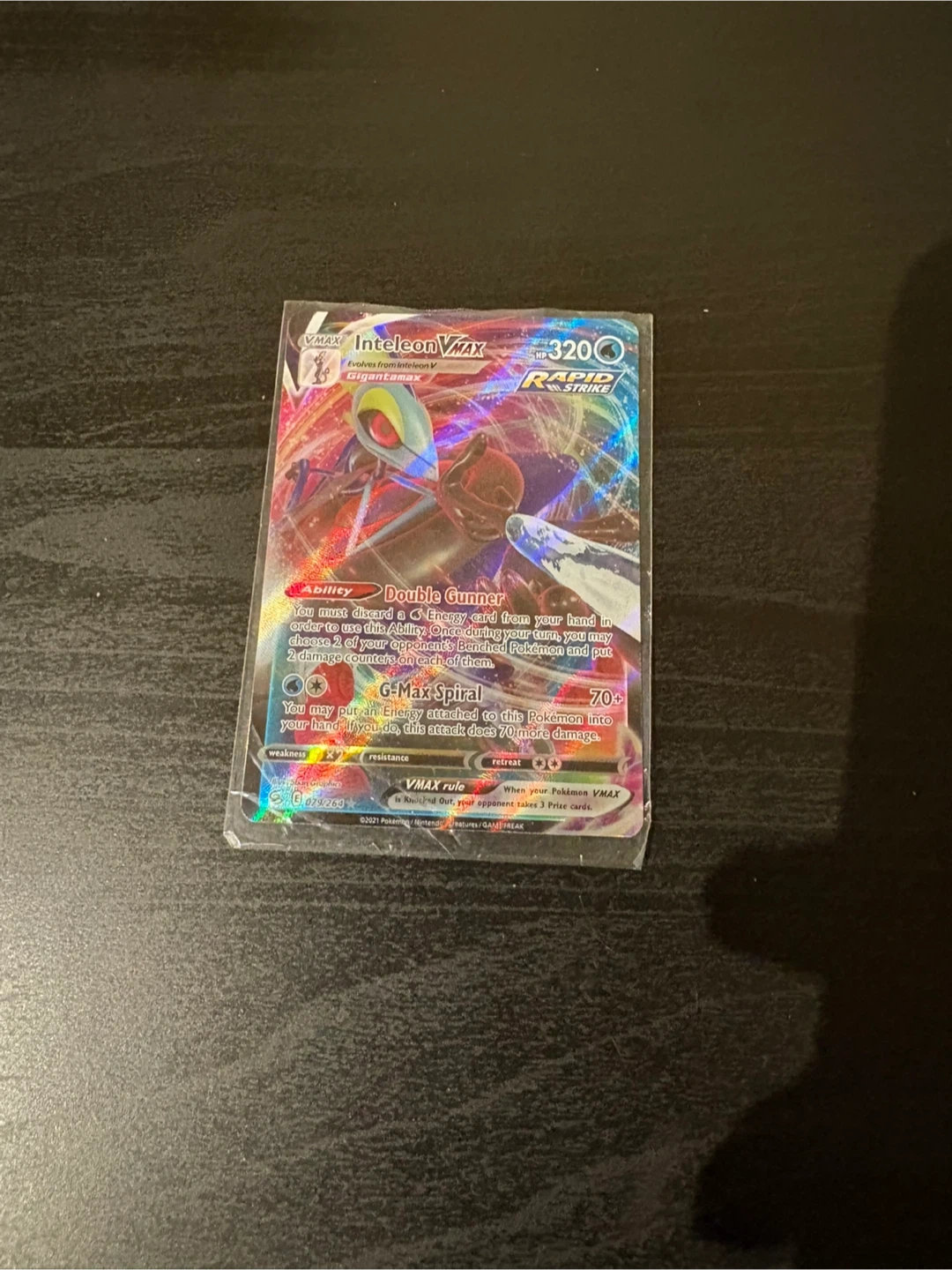 This is an Inteleon VMAX Rapid Strike card. It has the Double Gunner ability. Great for collectors! And no delivery’s you have to come pick it up or we meet somewhere.