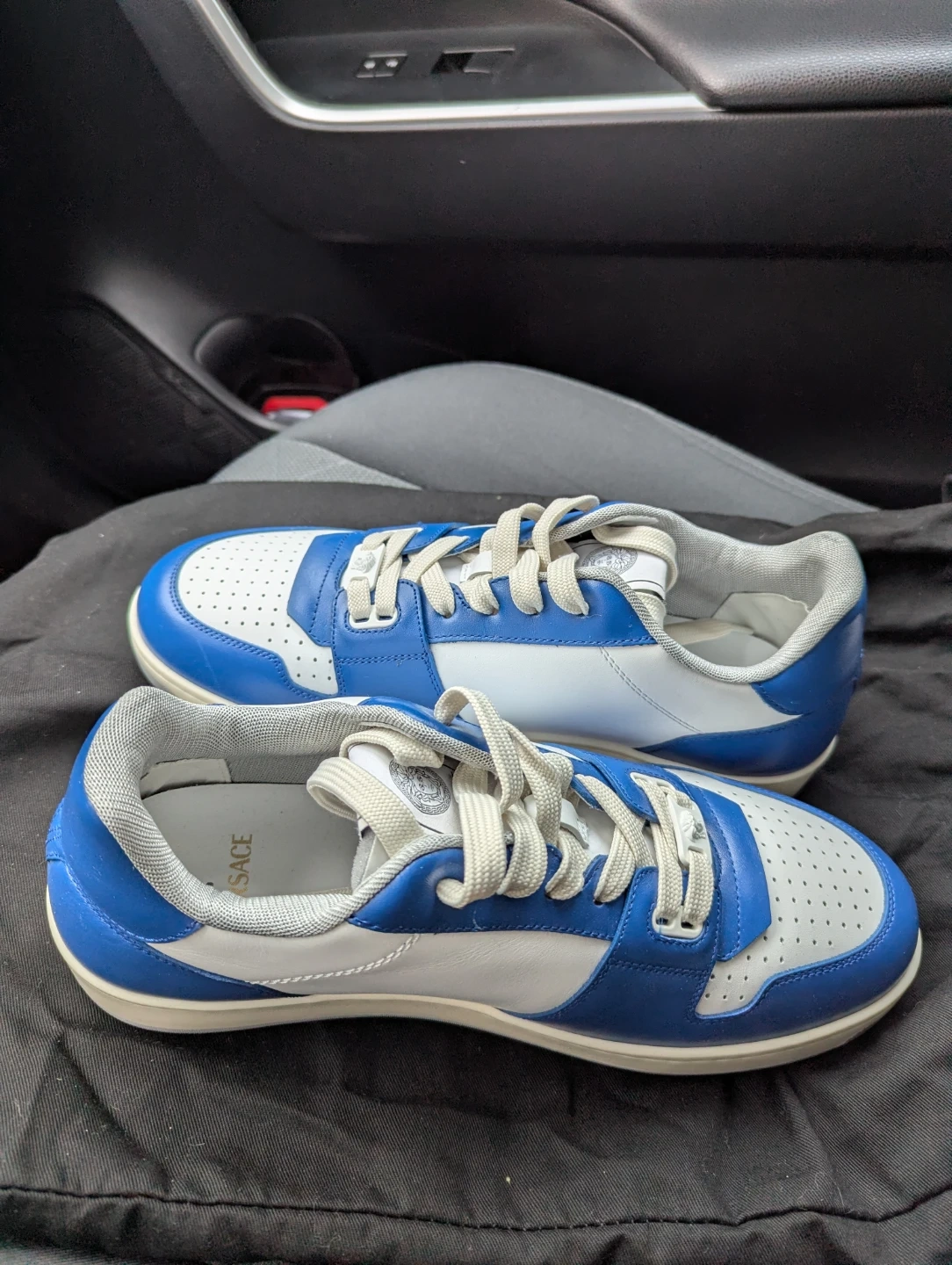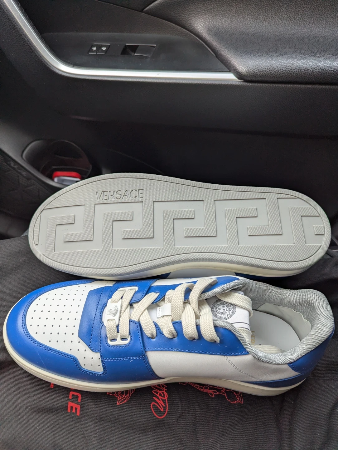 These Versace Medusa Spirit sneakers feature a classic blue and white colourway. They're made in Italy and come in size 42. The sole has the iconic Greek key pattern.