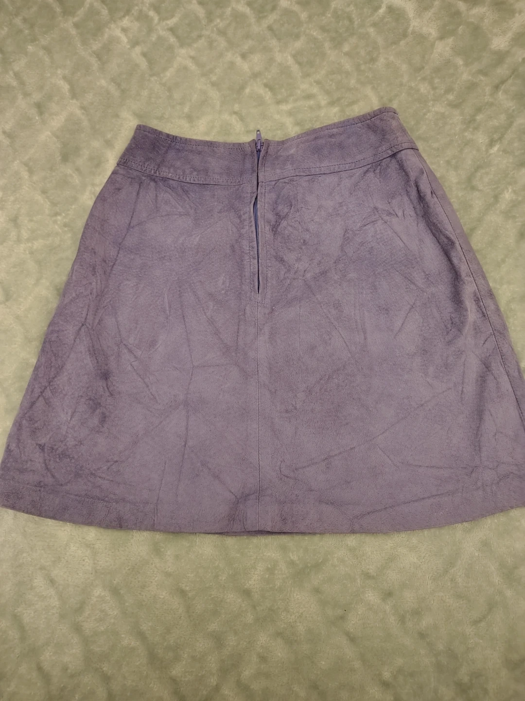 A Danier Canada mini skirt in a soft lavender colour. Made with genuine suede material. It features a back zipper closure.