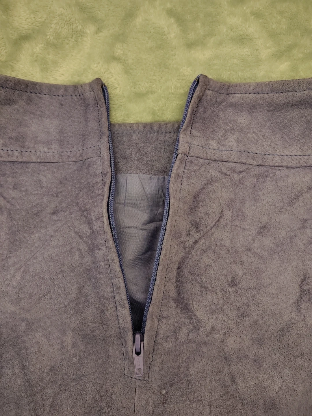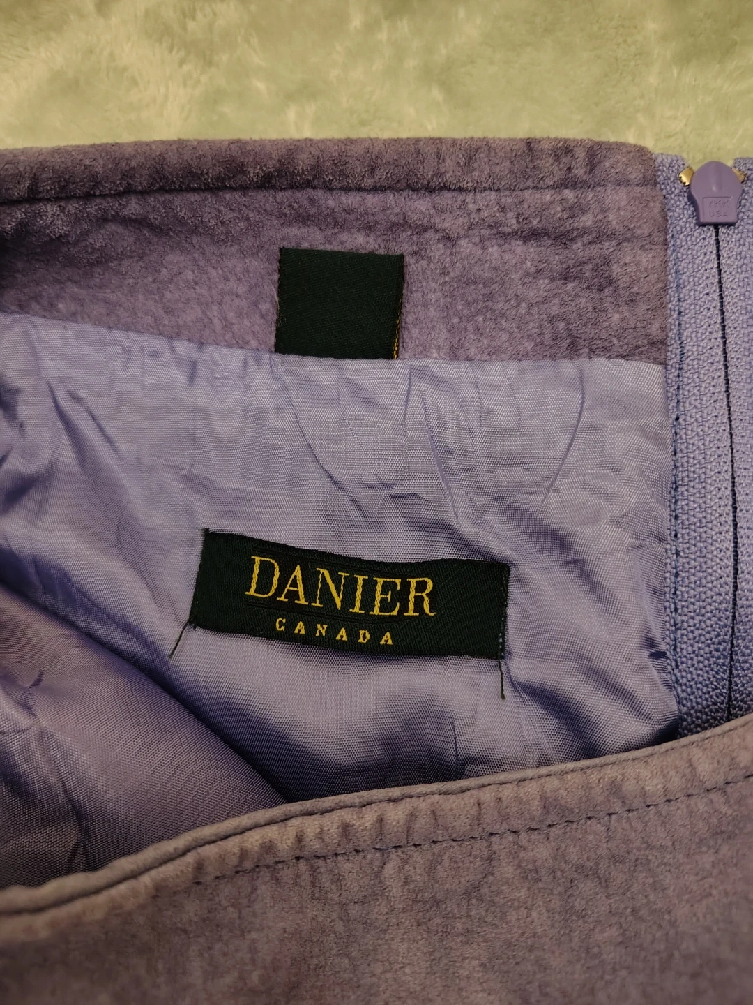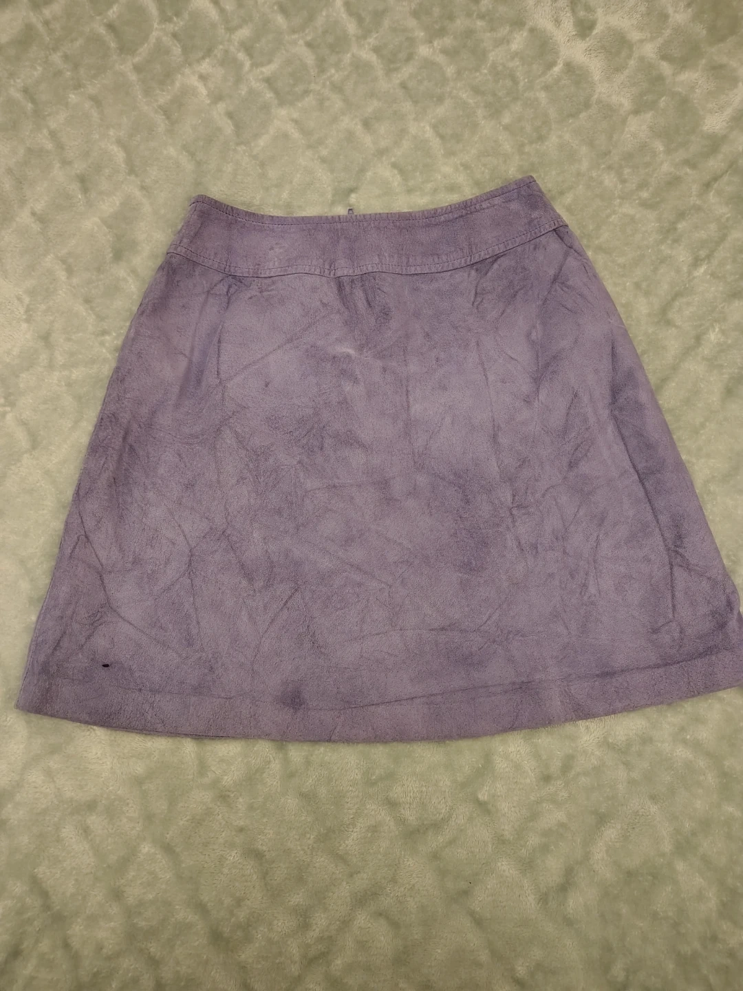 A Danier Canada mini skirt in a soft lavender colour. Made with genuine suede material. It features a back zipper closure.