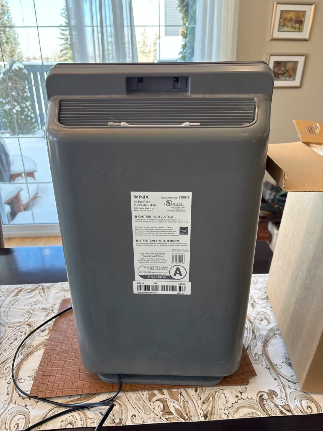Winix 5300-2 air purifier with PlasmaWave technology. This unit includes the main air purifier and a new filter set still in plastic. It has multiple fan speeds and an air quality sensor. Ready to improve your home's air quality!