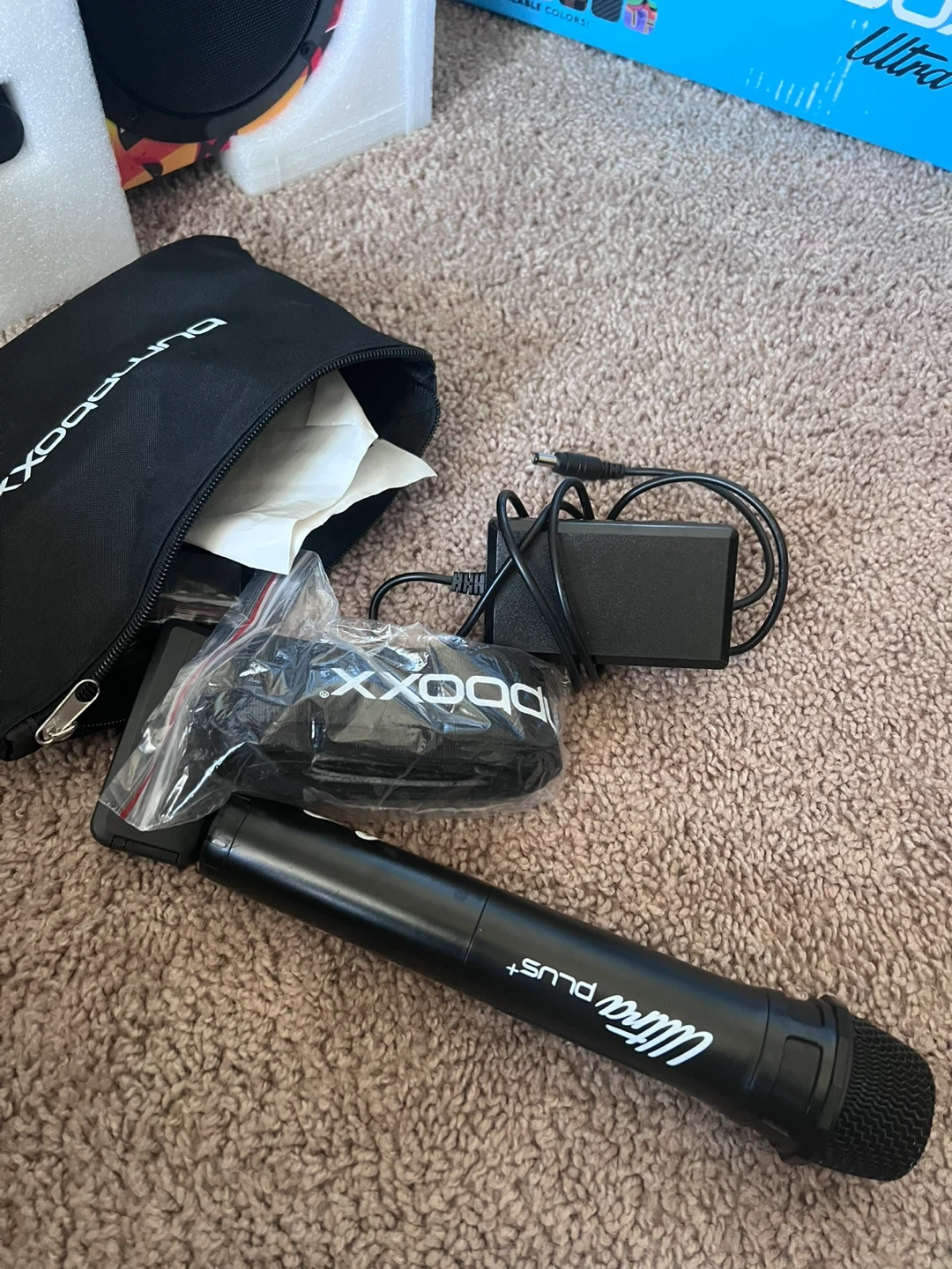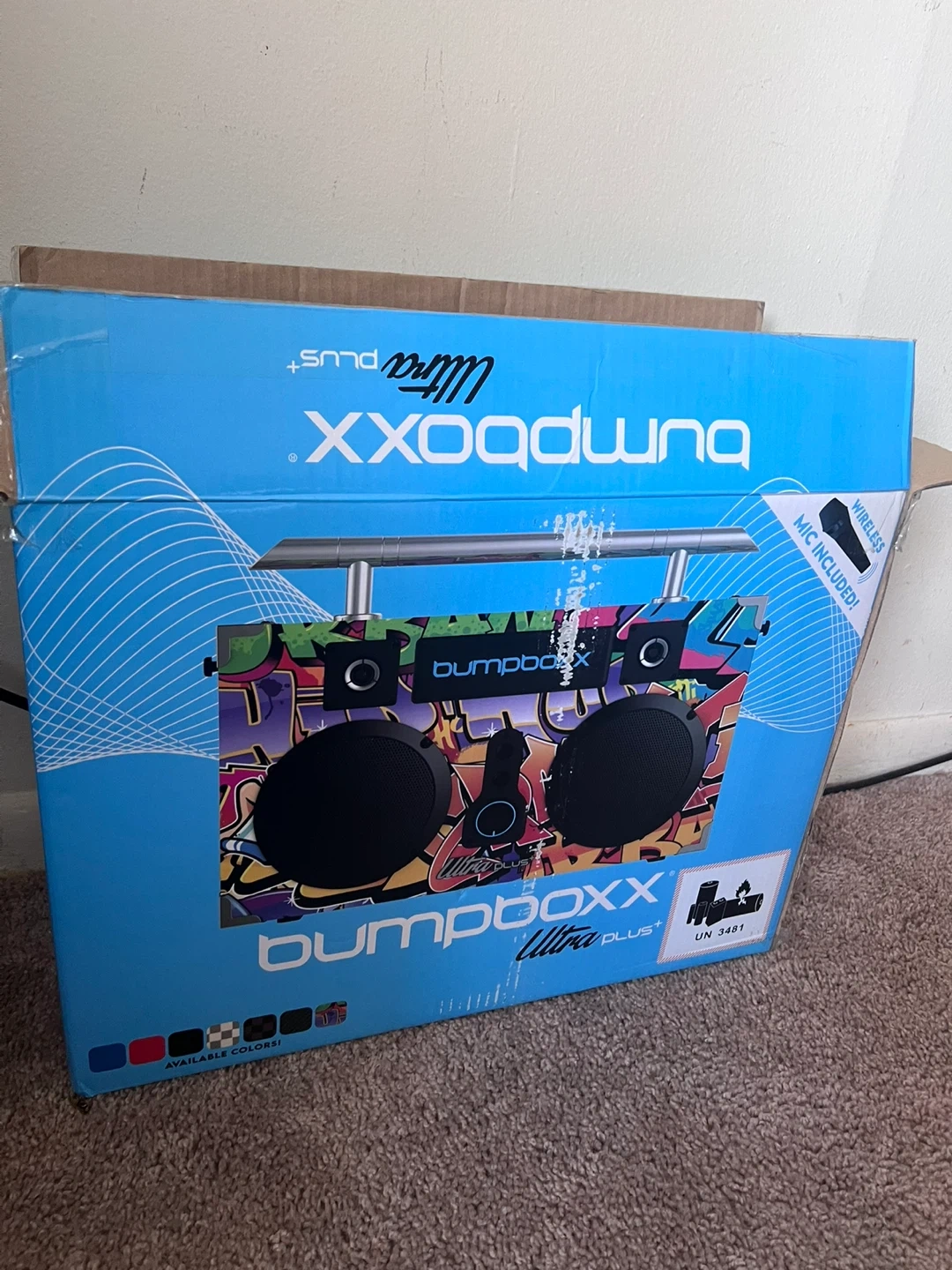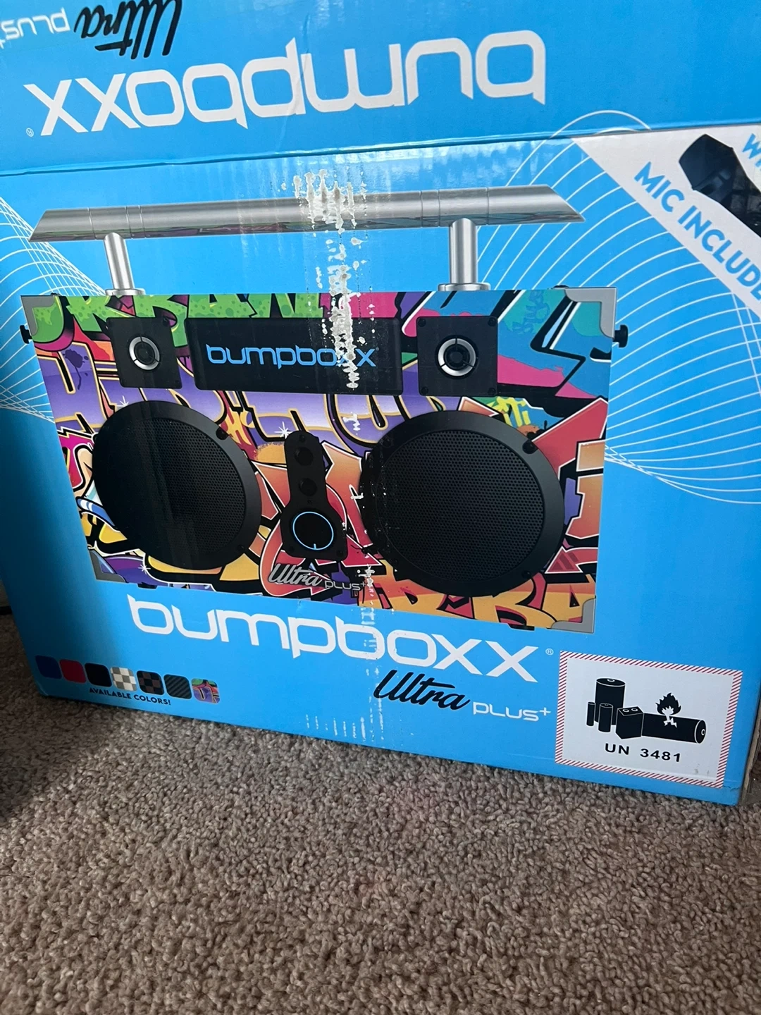 This portable speaker has a colorful graffiti design. It includes a microphone and a charging cable. Comes in original box with foam packaging.