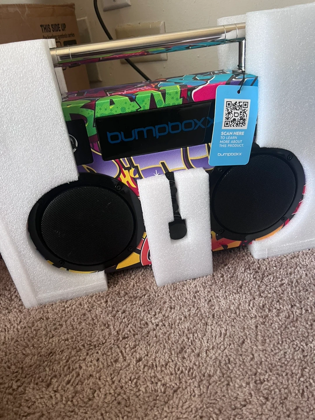 This portable speaker has a colorful graffiti design. It includes a microphone and a charging cable. Comes in original box with foam packaging.