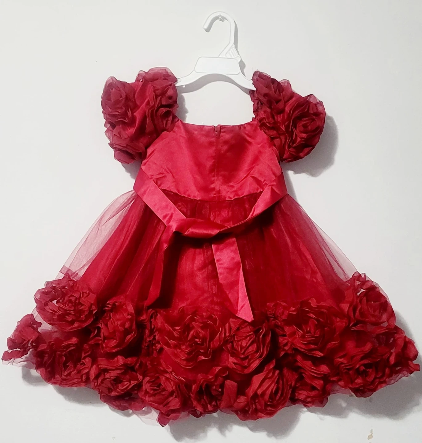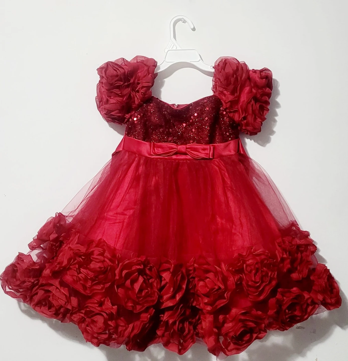 A stunning red dress for little ones, featuring a sequined bodice and a fluffy tulle skirt adorned with fabric roses. It has adorable puff sleeves with rose details and a satin bow at the waist. Perfect for special occasions!