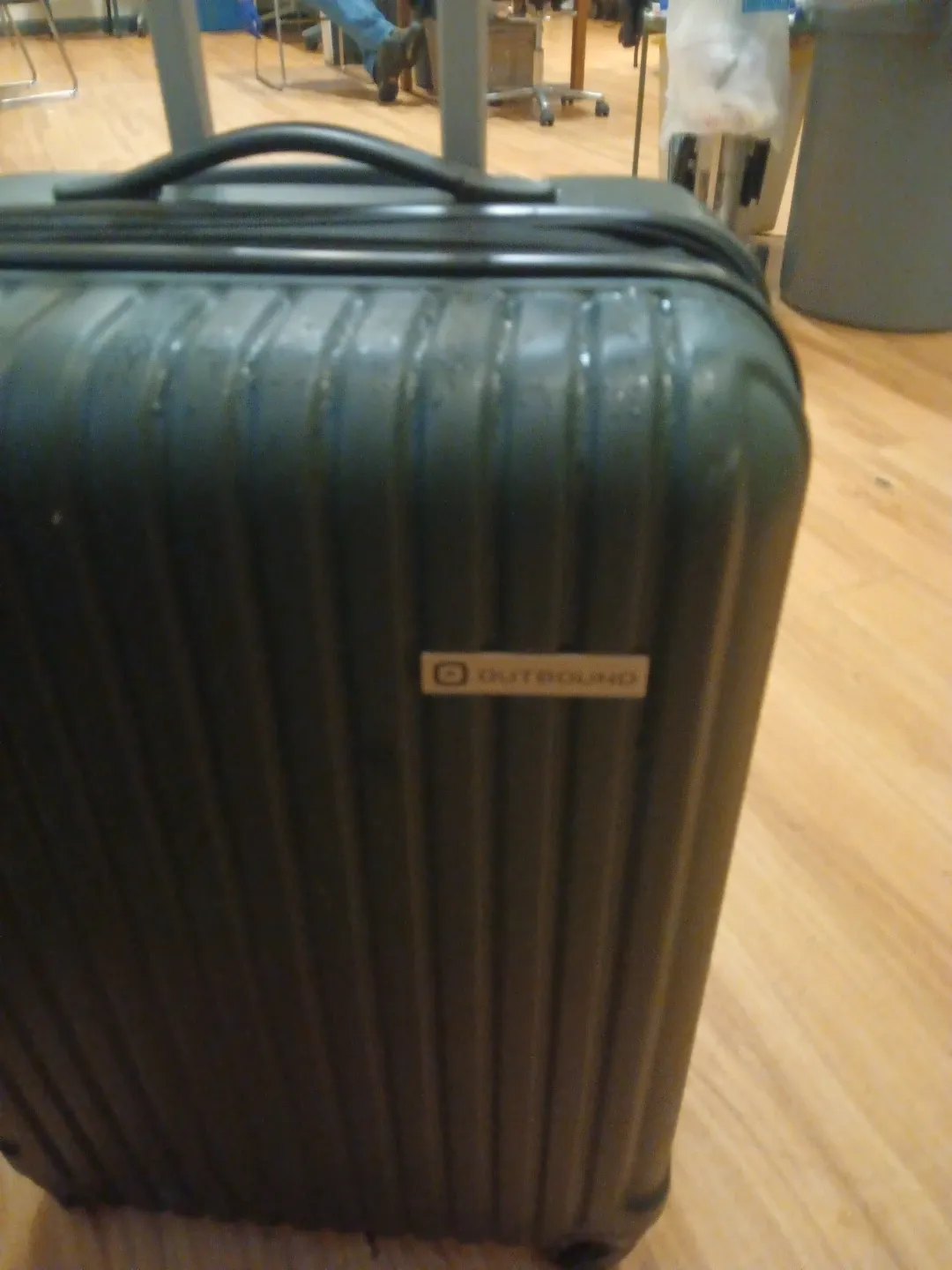 This is a dark green suitcase from Outbound. It has a ridged hard shell and a retractable handle with wheels for easy transport. This luggage is built to withstand travel.