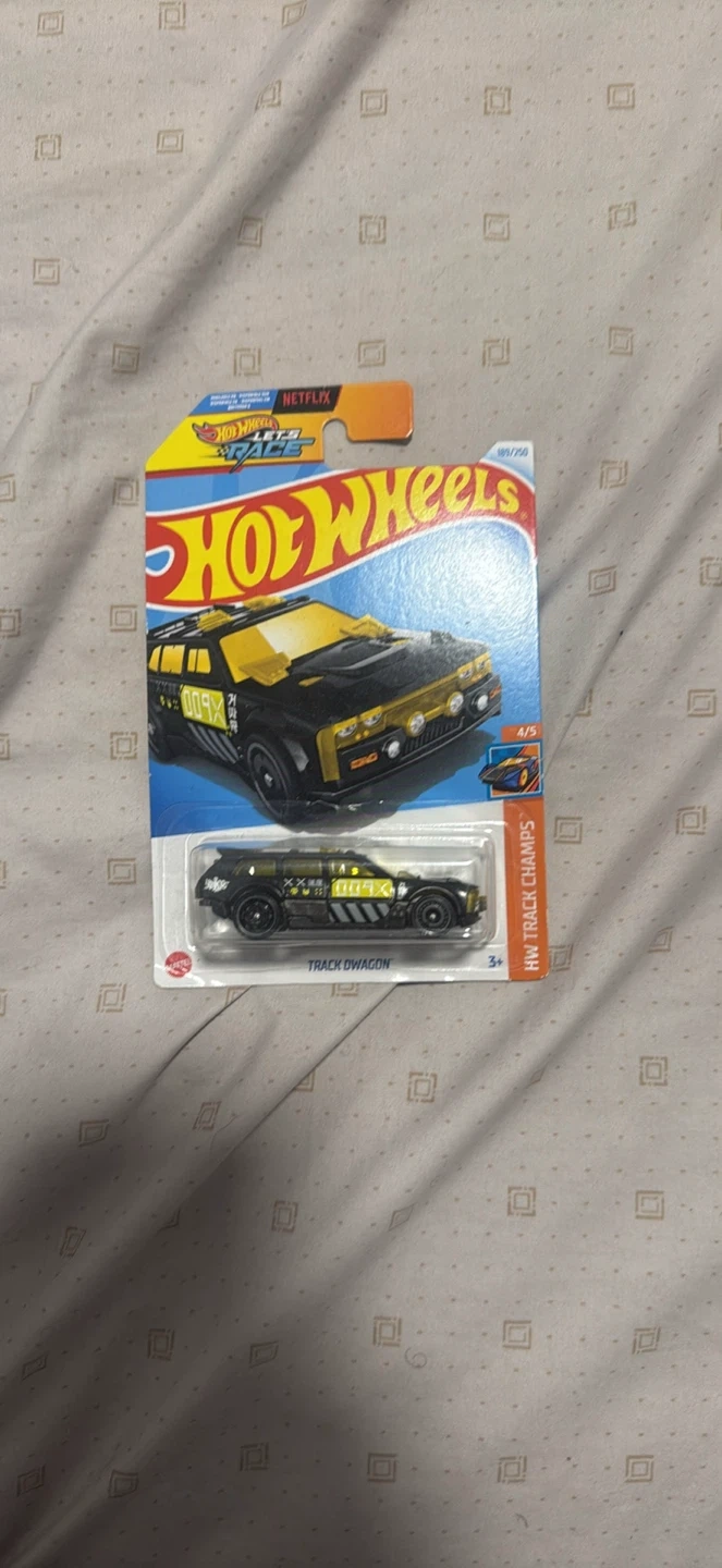 This is a Hot Wheels die-cast car. It's the Track Dwagon model, part of the HW Track Champs series. The car is black with yellow accents. Suitable for ages 3 and up.