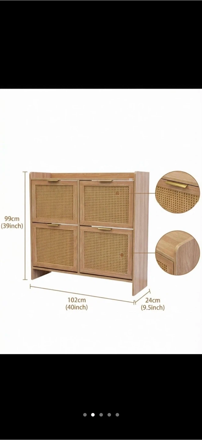 Four-door shoe cabinet with cane detailing. Wood construction. Dimensions: 102cm (40in) W x 99cm (39in) H x 24cm (9.5in) D.