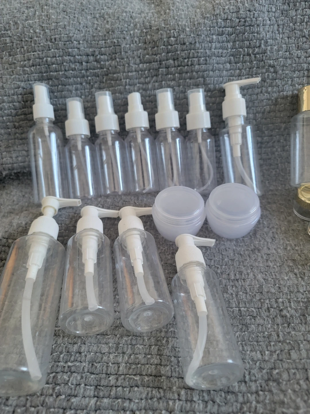 Set of 13 Clear Travel Bottles with Pumps and Sprayers