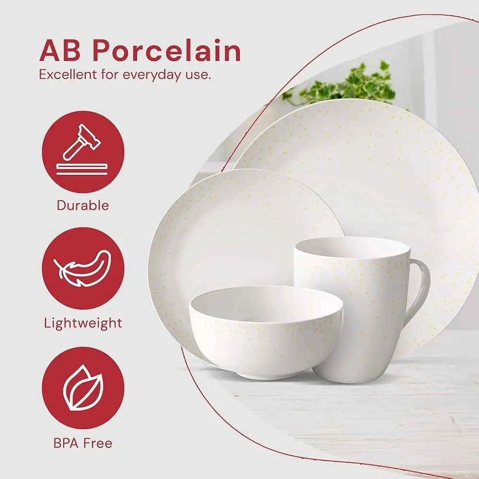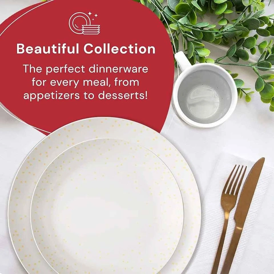 Elevate your table setup with this Safdie & Co. dinnerware set! It features a stunning white & gold speckled detailing for a touch of elegance. The fine craftsmanship makes these plates and bowls ideal for everyday use. This 16-piece set includes four dinner plates, four salad plates, four bowls, and four mugs. Each piece has a simple yet bold minimalist design. Serve your meals on this lightweight, non-toxic set, which is safe for the whole family. These plates are excellent for home-cooked meals, catering, picnics, and more. Use them for any occasion!