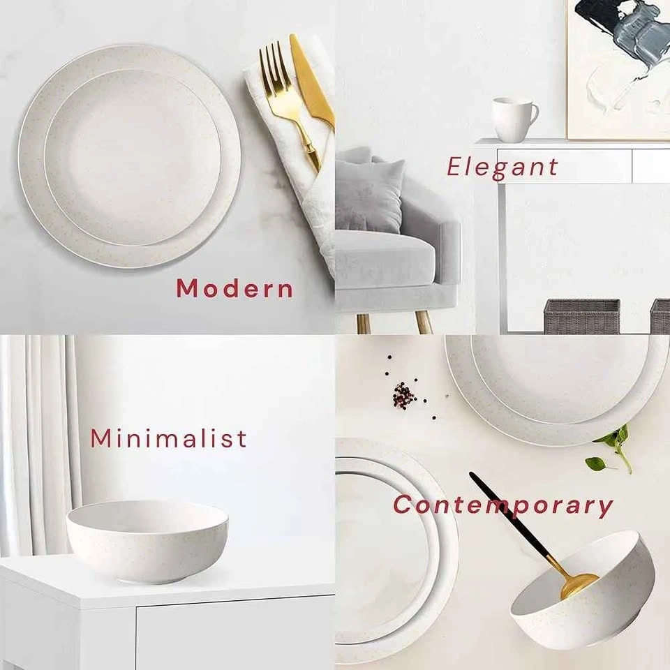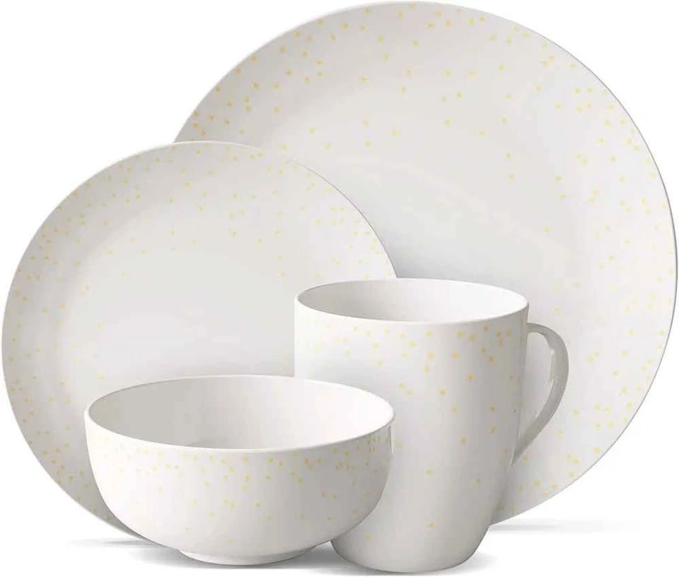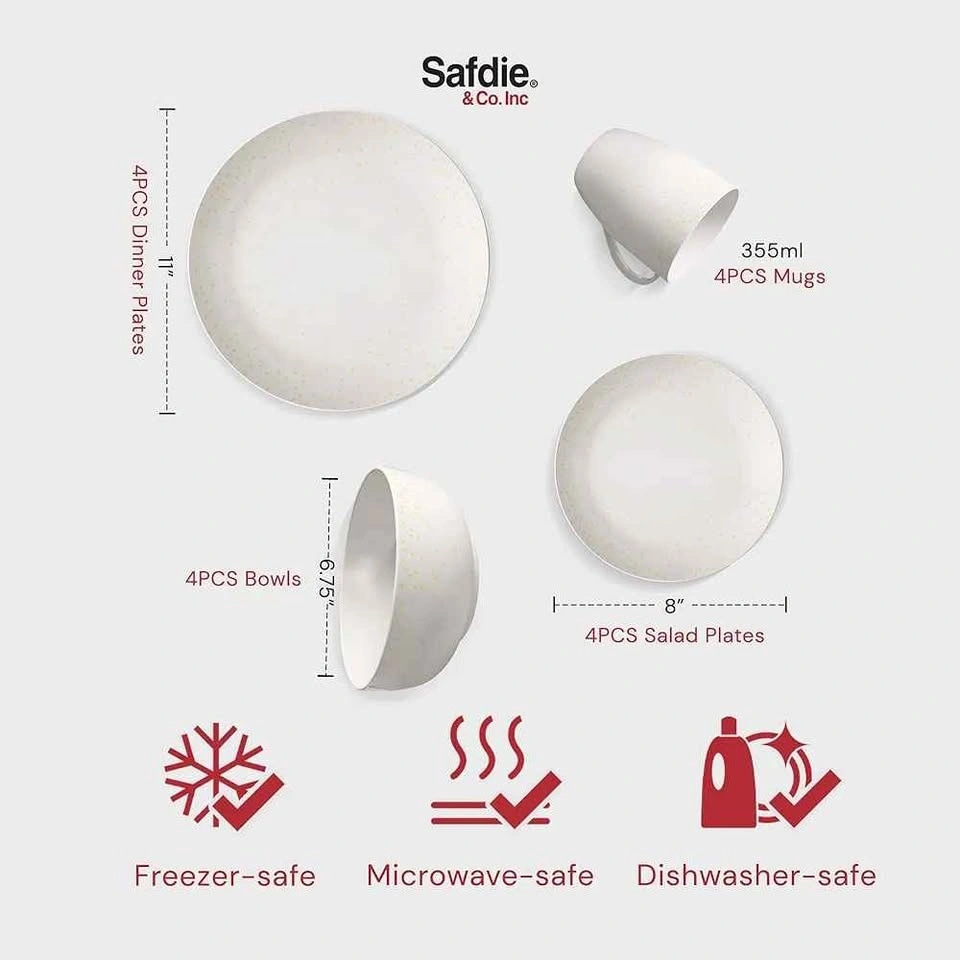 Elevate your table setup with this Safdie & Co. dinnerware set! It features a stunning white & gold speckled detailing for a touch of elegance. The fine craftsmanship makes these plates and bowls ideal for everyday use. This 16-piece set includes four dinner plates, four salad plates, four bowls, and four mugs. Each piece has a simple yet bold minimalist design. Serve your meals on this lightweight, non-toxic set, which is safe for the whole family. These plates are excellent for home-cooked meals, catering, picnics, and more. Use them for any occasion!