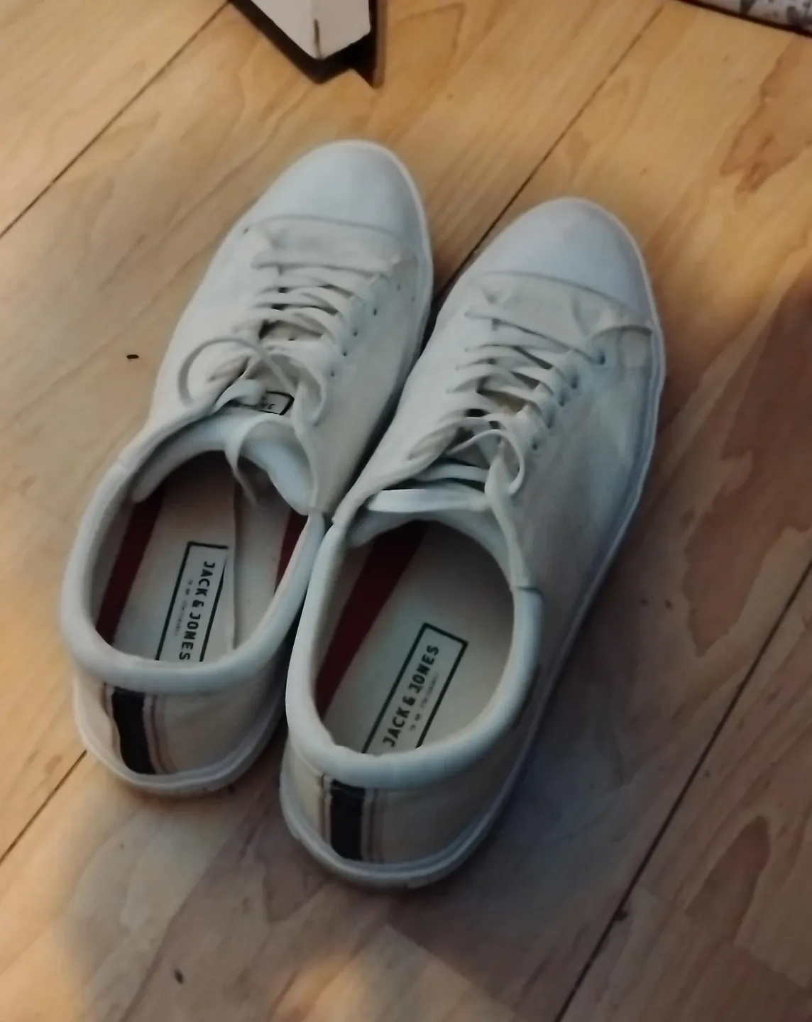 These Jack & Jones sneakers are made of cream-coloured canvas. They feature a white sole and lace-up closure. The interior lining is red and white.