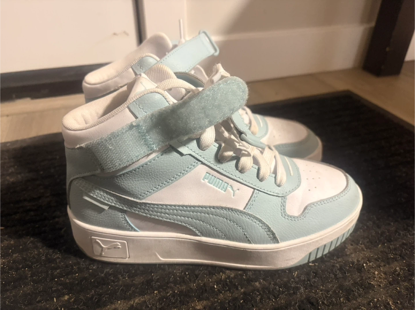 Puma high-top sneakers in white and light blue. They're a women's size 7 US. Features adjustable velcro straps over laces. Made in China.