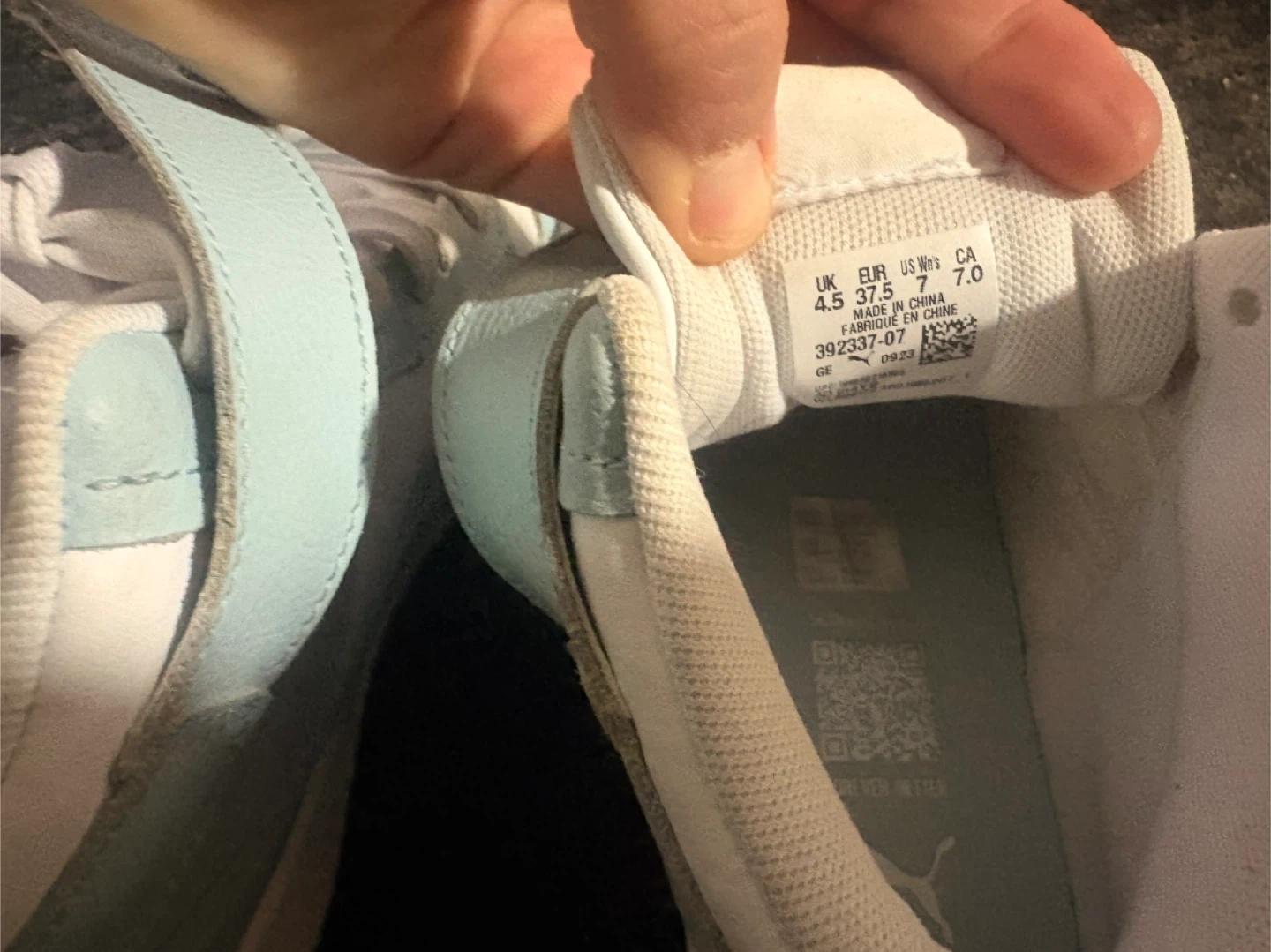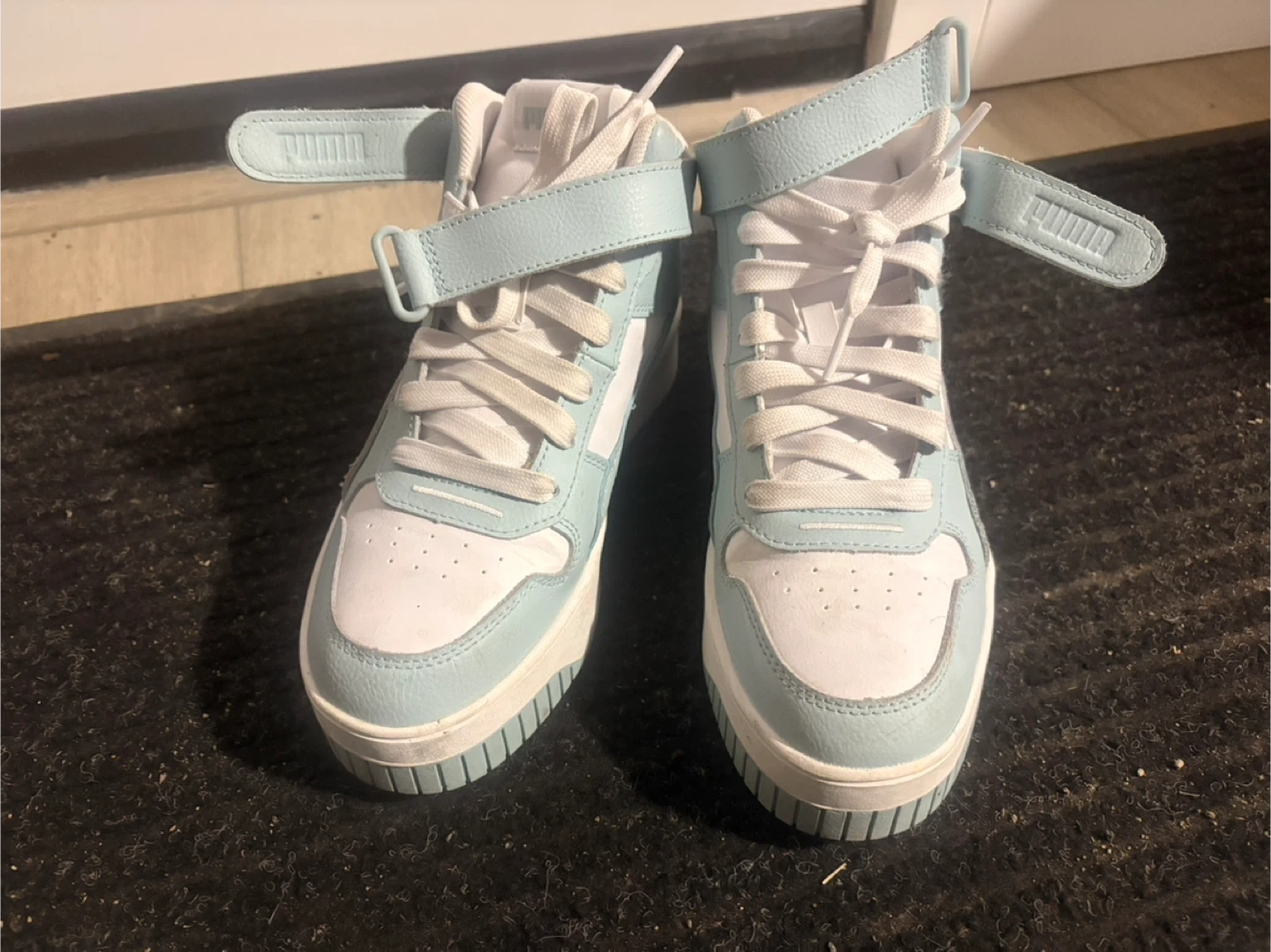 Puma high-top sneakers in white and light blue. They're a women's size 7 US. Features adjustable velcro straps over laces. Made in China.