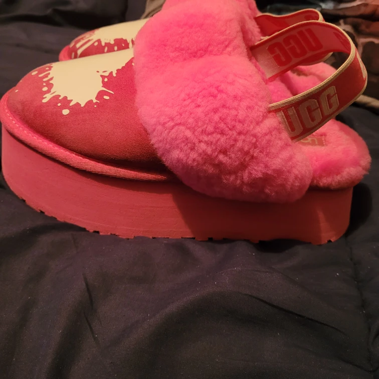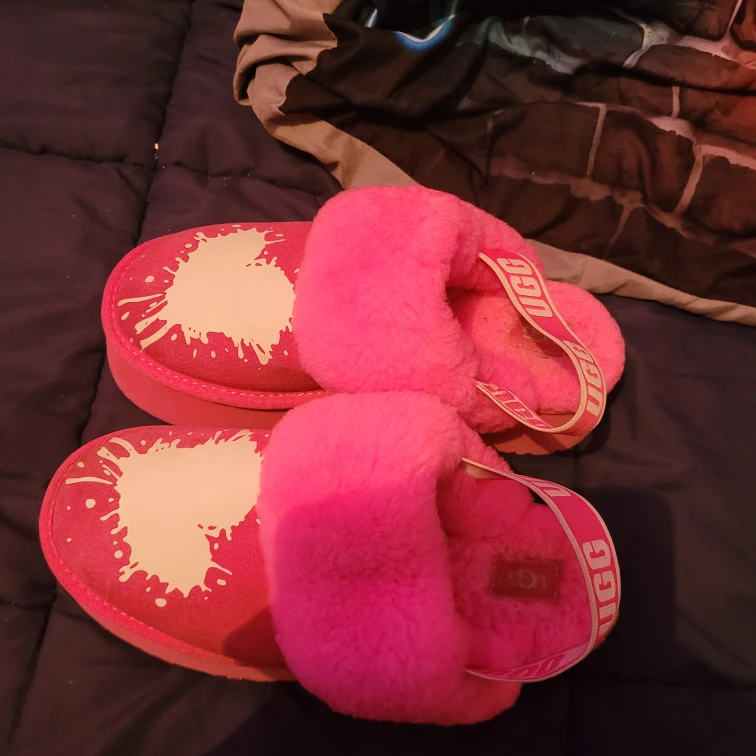 These UGG Fluff Yeah slides are in a vibrant pink colour! They are super comfortable and stylish for everyday wear. The UGG logo is prominently displayed on the strap. Perfect for adding a pop of colour to your outfit!