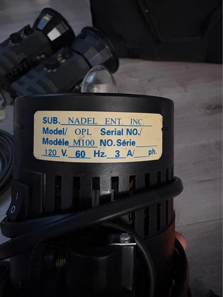Old photography light fixtures and accessories including: Balcar mini z2 X 2 with power cables, Nadel OPL M100, Manfrotto clamps for light attachment X 2, small clamps X 4, receivers X 3, and a professional bag to hold everything! Located in Richmond. Price negotiable.
