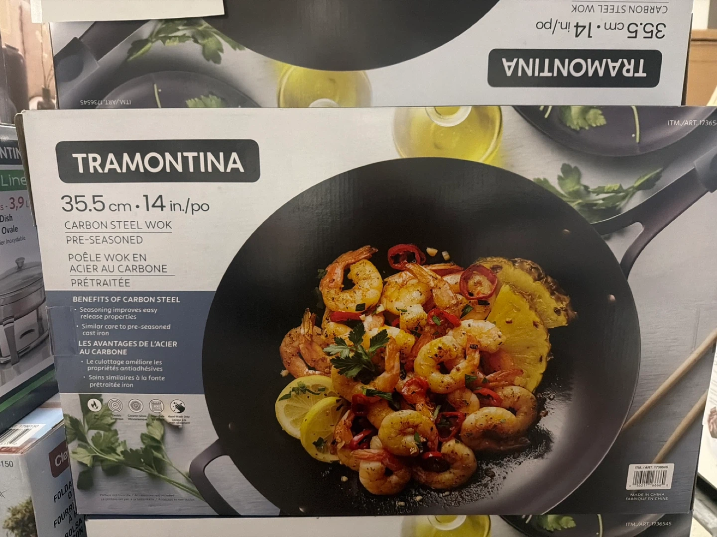 This is a Tramontina carbon steel wok, pre-seasoned for easier use. It's 35.5 cm (14 inches) in diameter. Carbon steel helps with even heating and seasoning improves over time.