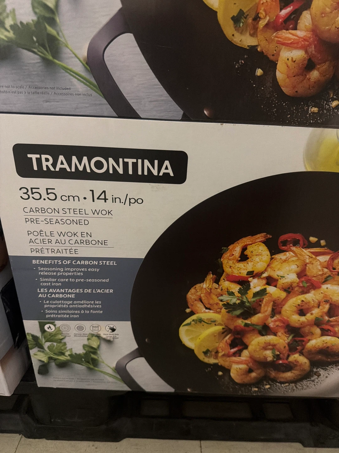 This is a Tramontina carbon steel wok, pre-seasoned for easier use. It's 35.5 cm (14 inches) in diameter. Carbon steel helps with even heating and seasoning improves over time.