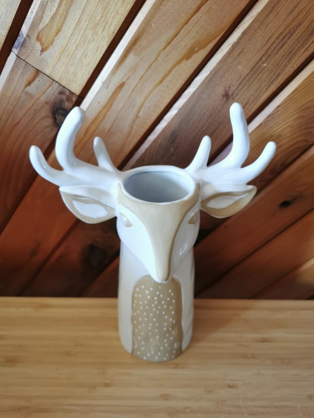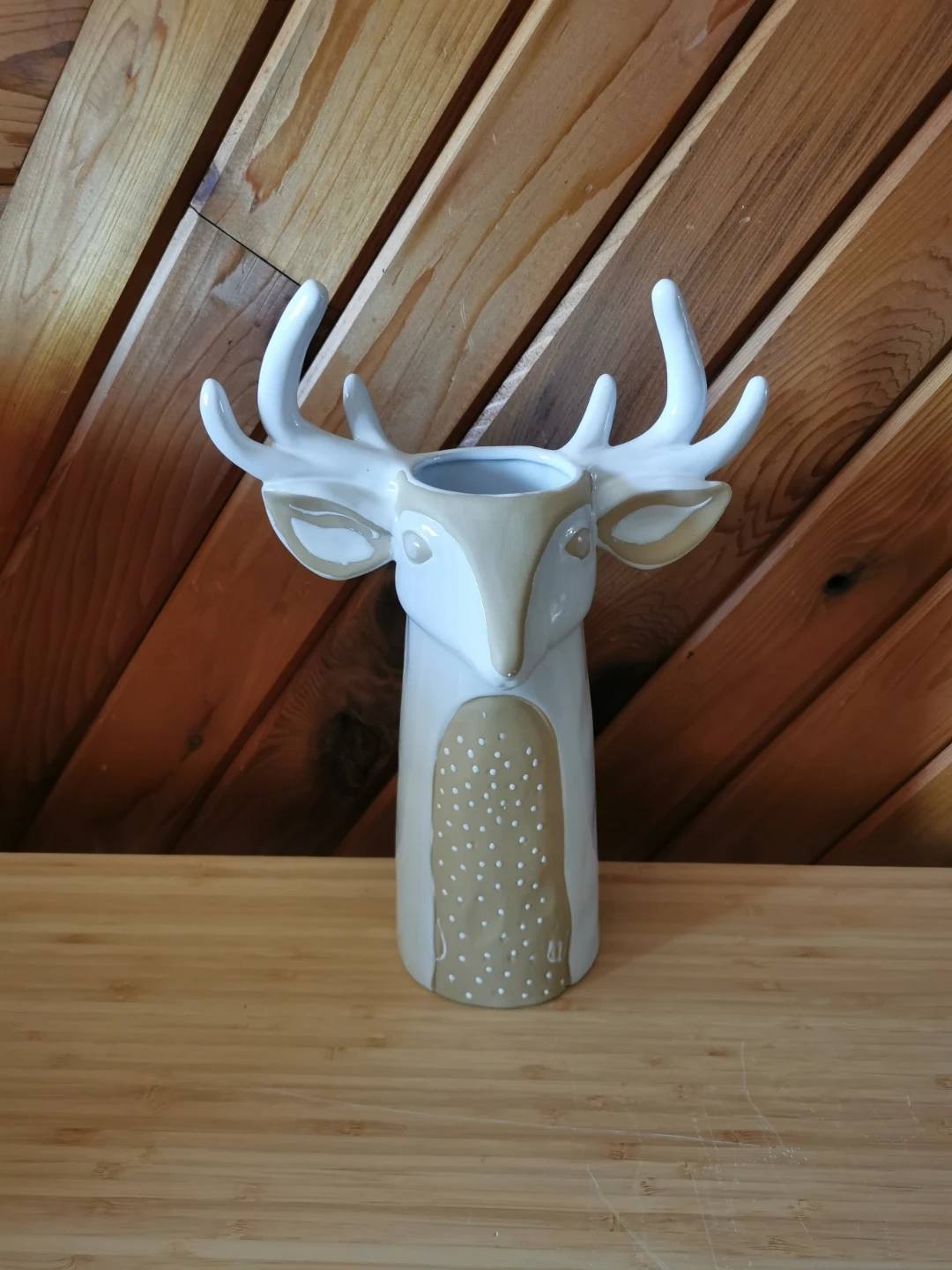 Beautiful Anthropologie ceramic deer / stag vase in a soft neutral cream and taupe palette. Features sculptural antlers, sweet hand-painted facial details, and a whimsical woodland design that makes it perfect as a statement decor piece, dried floral holder, or seasonal accent.
