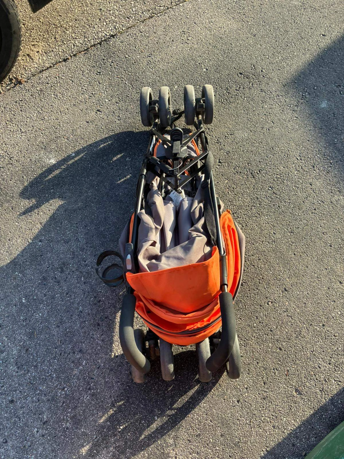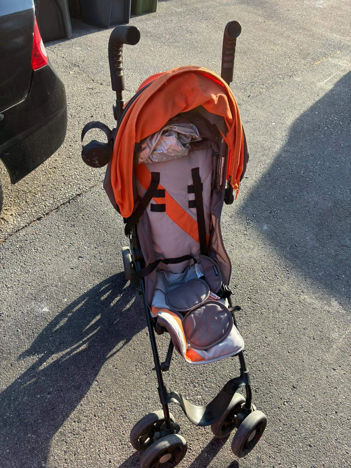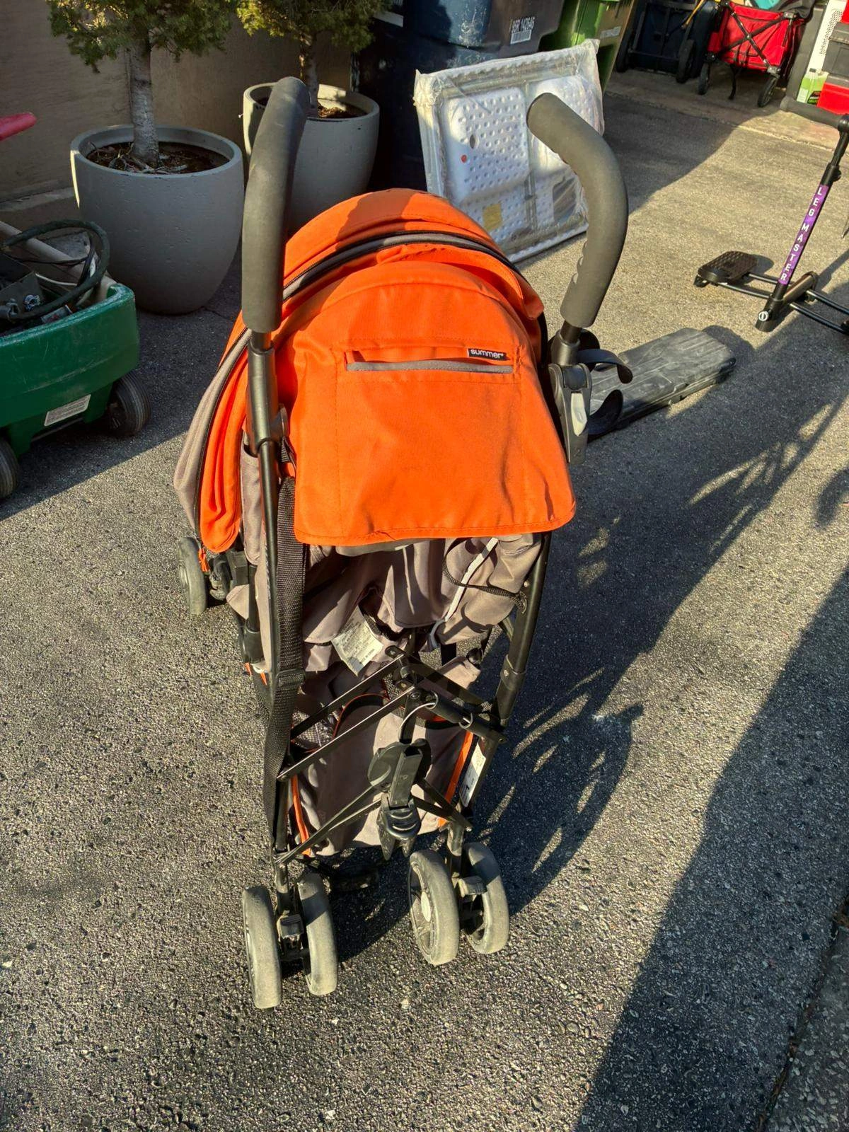 Features include a one hand fold, one hand recline, one hand adjustable footrest, and a one hand adjustable canopy
